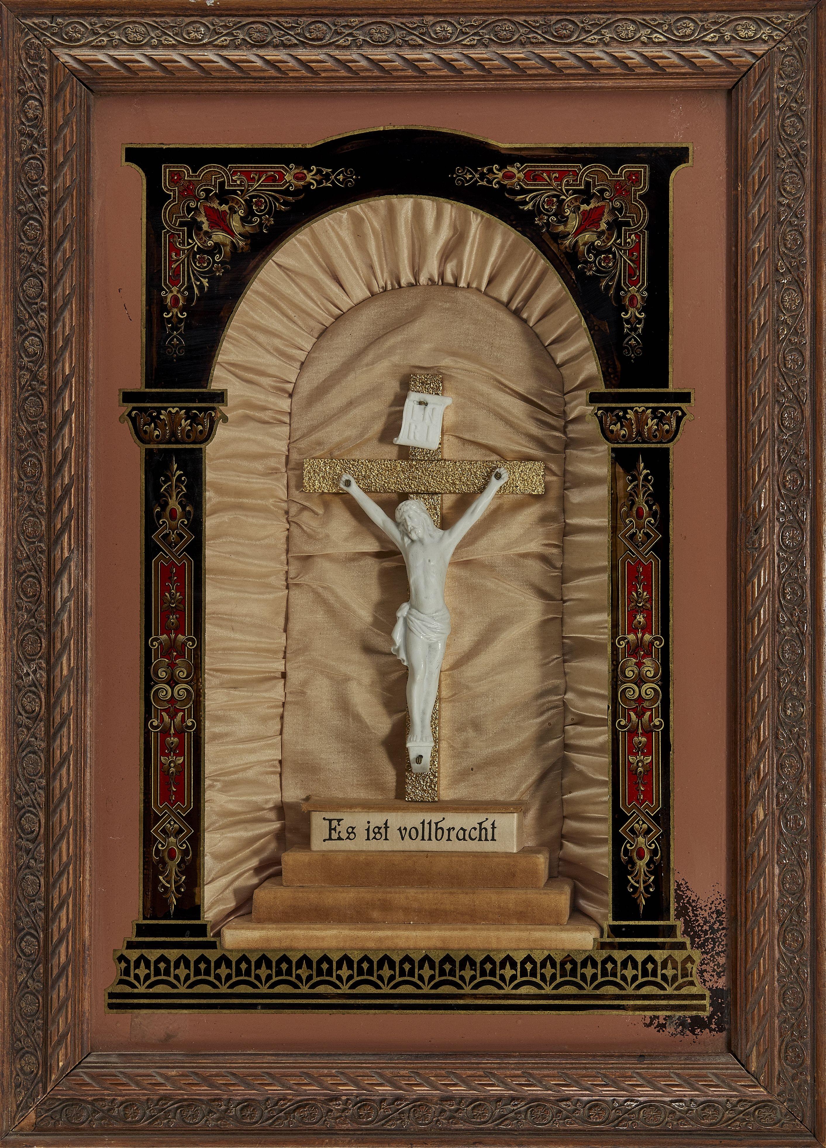 Porcelaine, tissu, bois et fixé sous verre, 63x45 cm