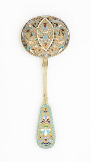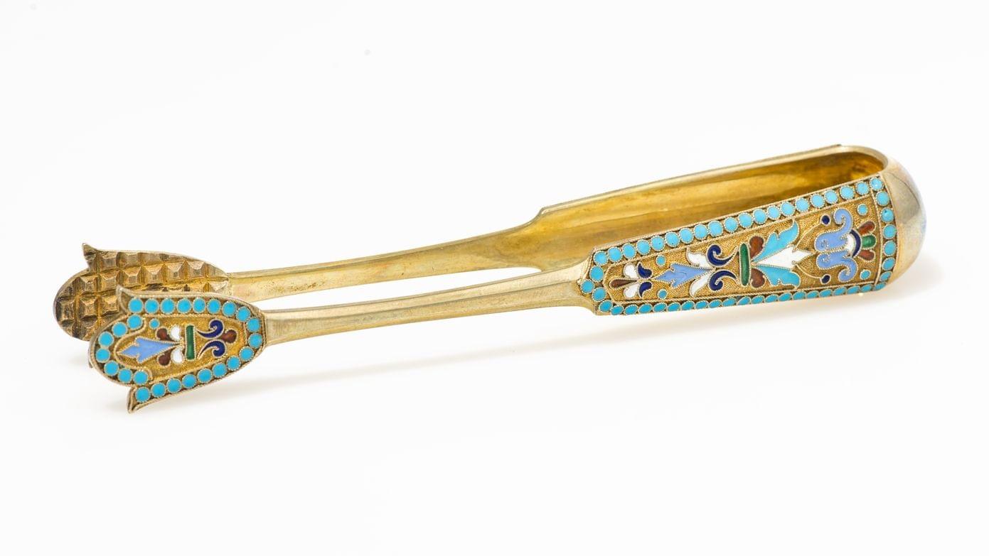 134. Cuillère à épices à manche torsadé, passoire et pince à sucre à décor de palmettes, rinceaux et perlettes en émaux cloisonnés