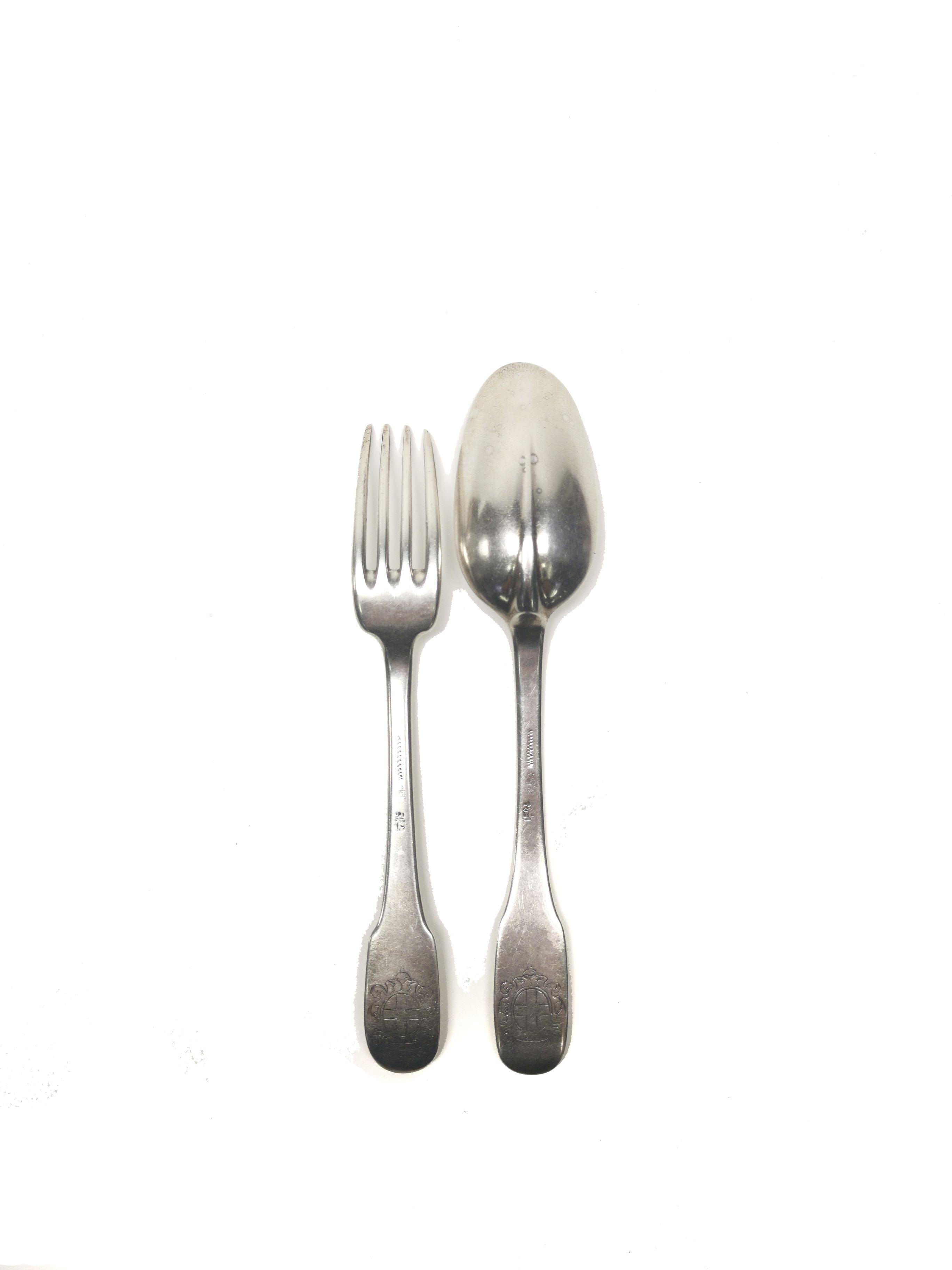 3634. Suite de 6 cuillères, 1 cuillère à saupoudrer et 1 pince
