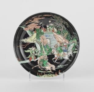 Porcelaine émaillée polychrome sur fond noir à décor de guerrier...
