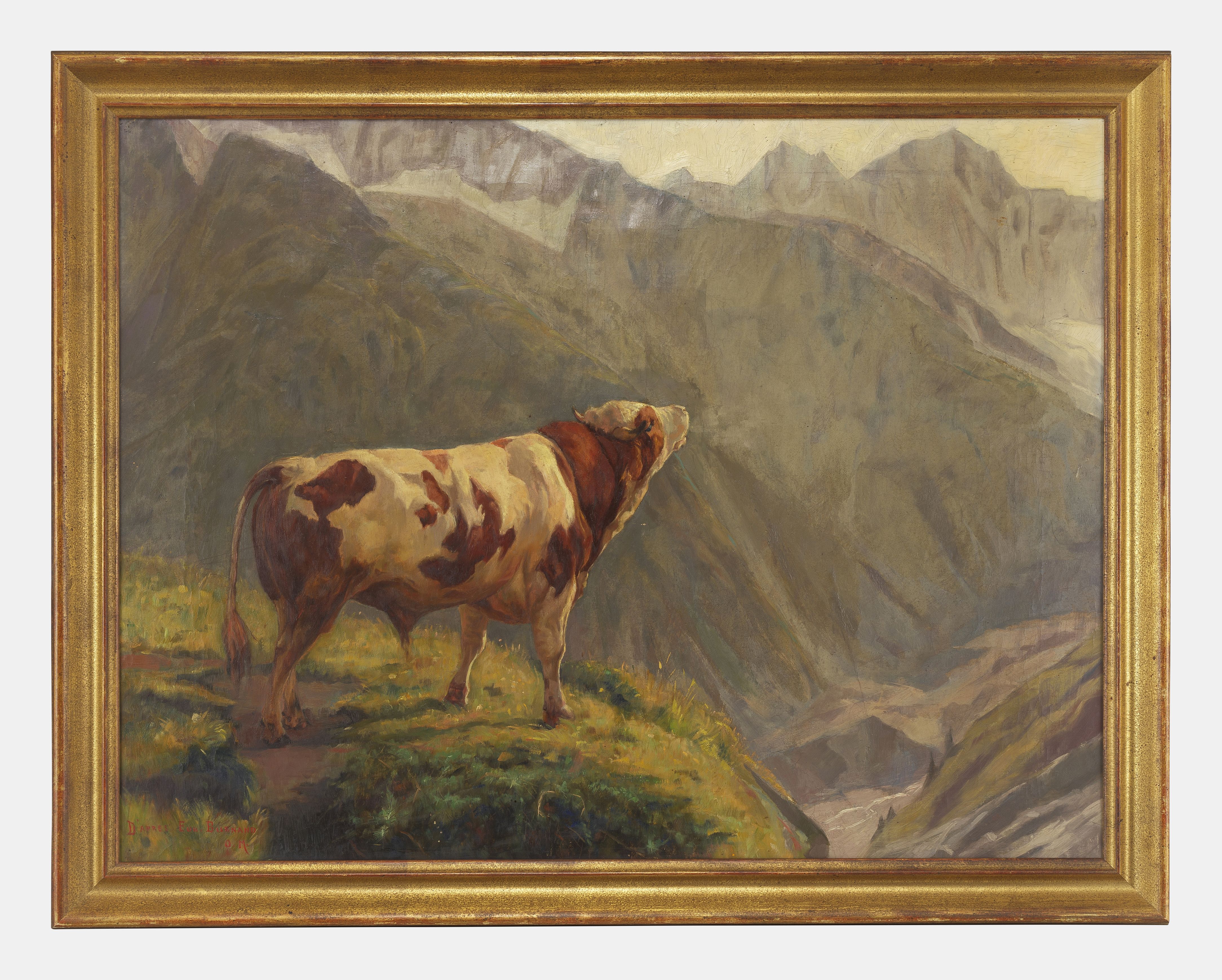 Taureau dans les Alpes, huile sur toile, 70x92 cm. L'original exposé au Musée Cantonal des Beaux Arts de Lausanne