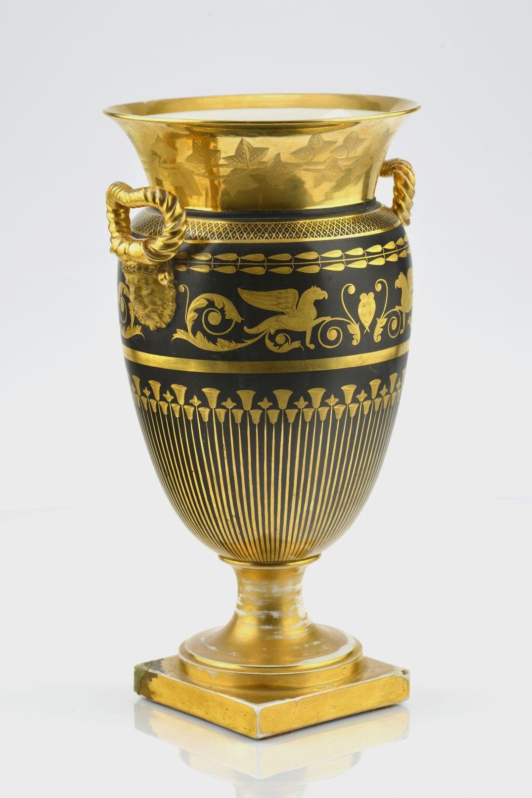 Vase balustre d'époque Empire à anses mascaron et décor or et noir de griffons Porcelaine, début XIXe s, H 35 cm