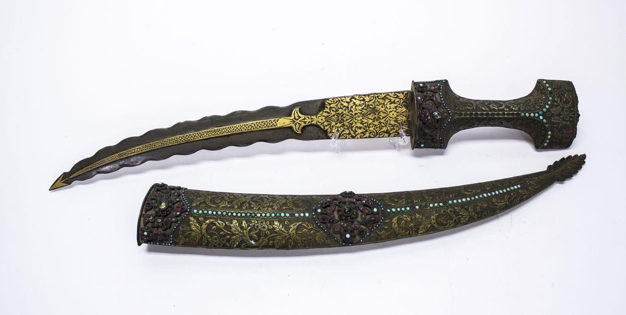 Lame damasquinée, fourreau en cuivre repoussé et incrustation de verrerie, L 58 cm