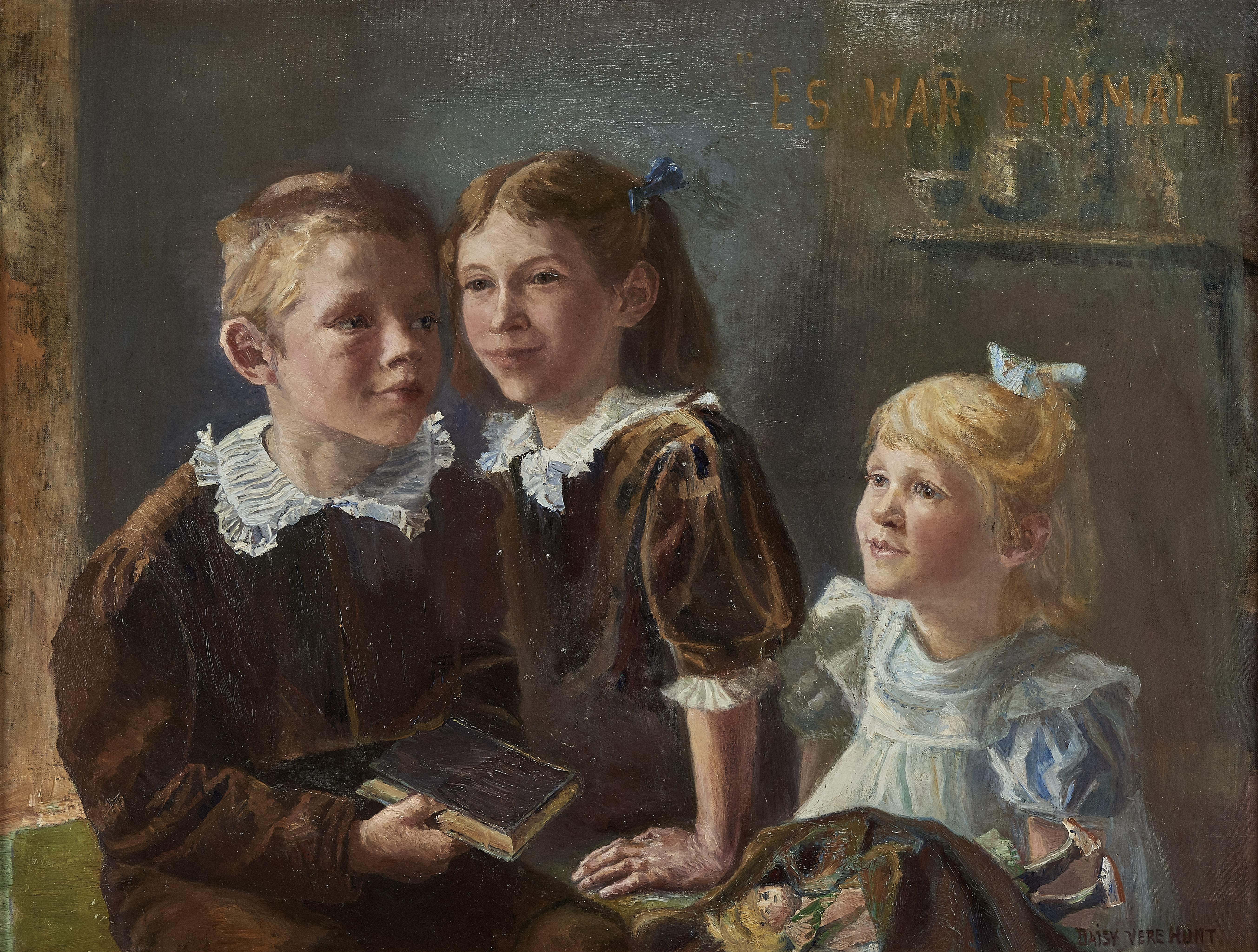 Es war einmal, portrait de trois enfants, huile sur toile, signée, 71x93 cm
