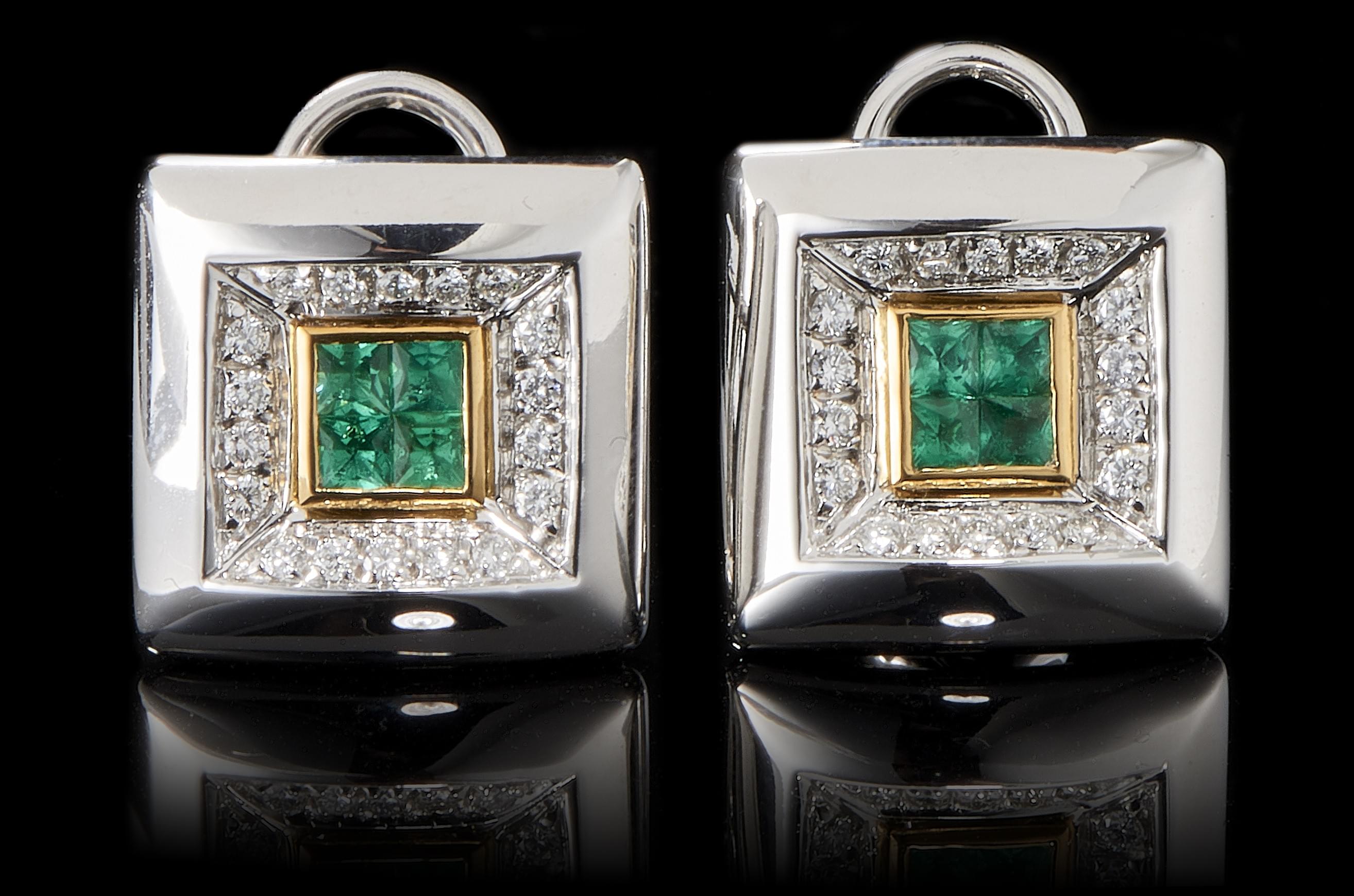 1059. Damiani, clips d'oreilles carrés sertis d'émeraudes calibrées entourées de diamants