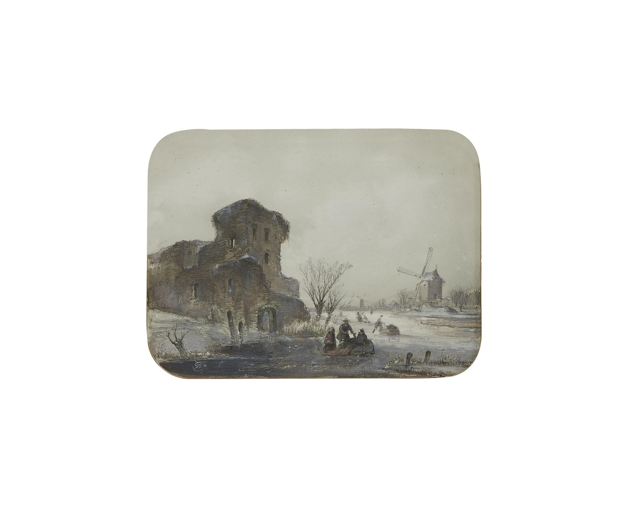 Scène animée de paysans aux moulins, huile sur carton, 12x16 cm