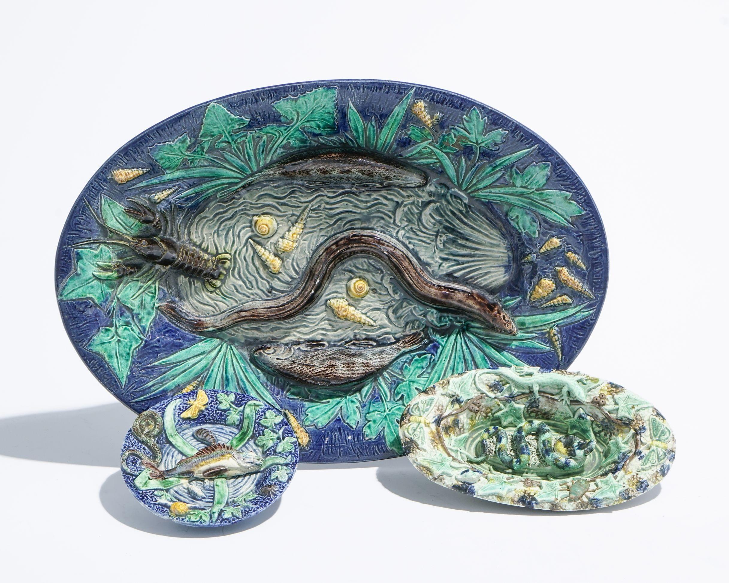 Un plat et deux petites assiettes à fond flammé et décor de poissons, coquillages et reptiles, barbotine, de 10 à 32 cm