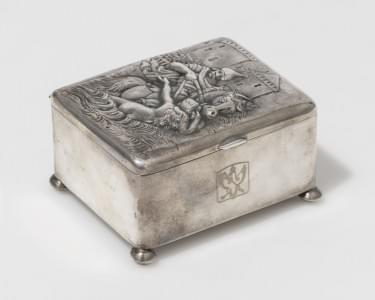 128. Coffret à décor repoussé d'un chevalier entraîné par une jeune f...