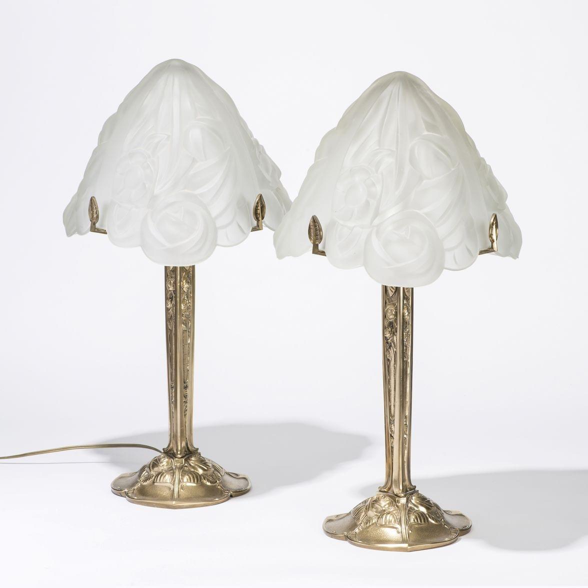 Paire de lampes, Verre moulé pressé et bronze, H 64 cm