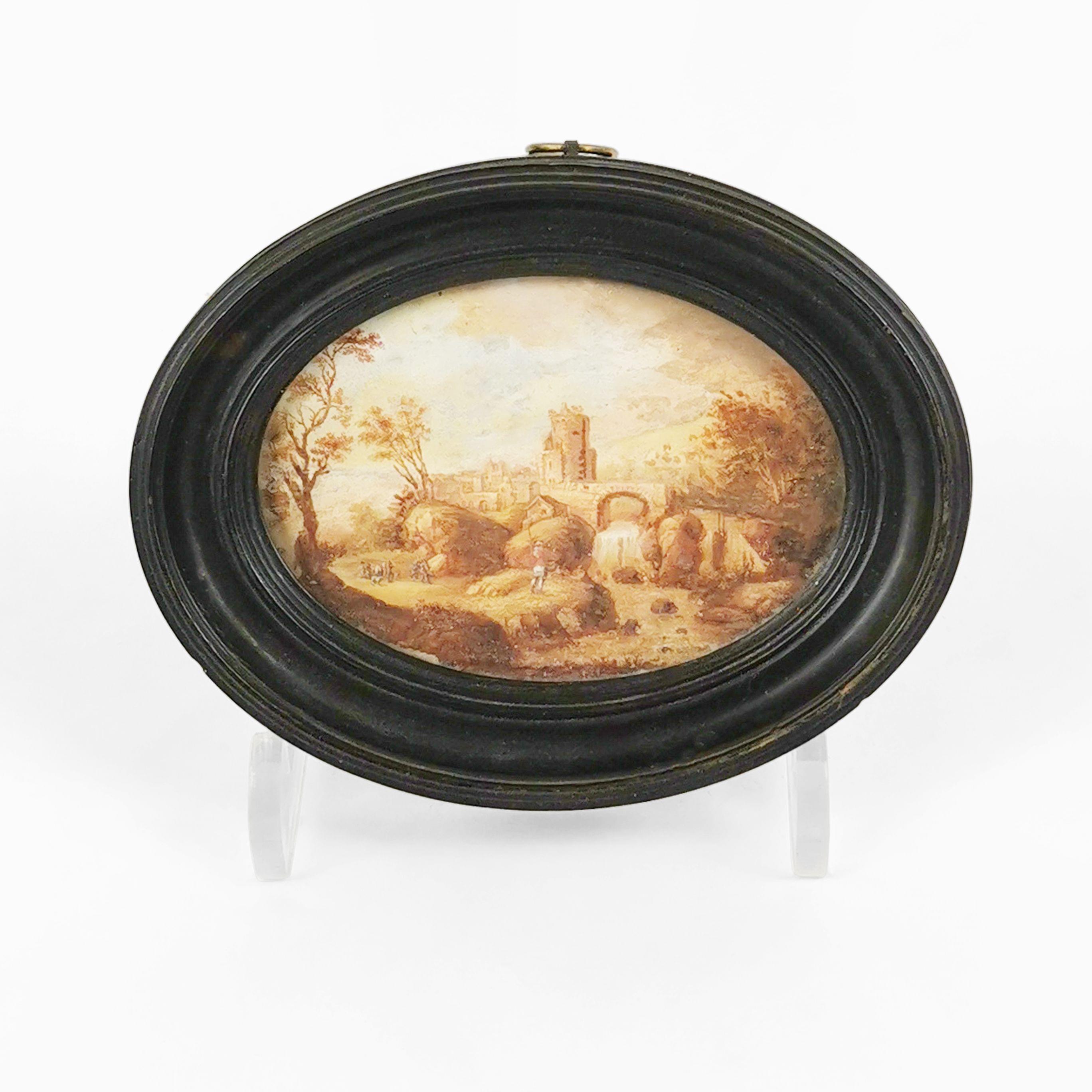 Paysage animé avec village au fond, gouache sur carton, 6x8 cm