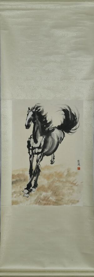 Cheval galopant, papier de riz peint à l'encre sur rouleau, signé, cachet, Chine, XXe s, 175x60 cm