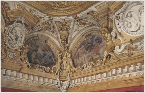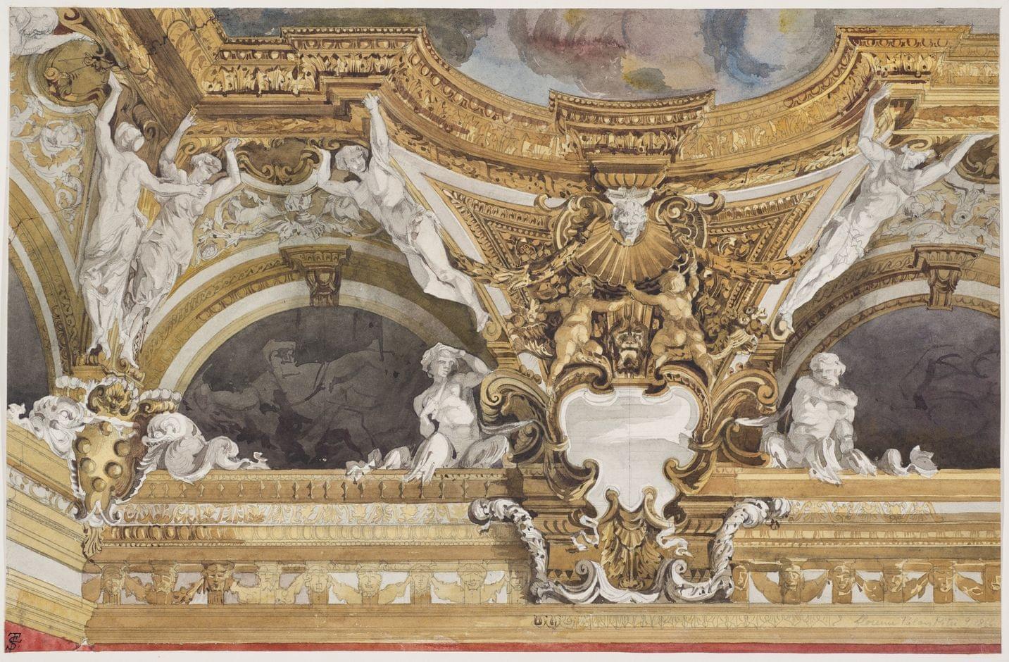 Décor de tragédie, aquarelle et encre sur papier monogrammée tit...