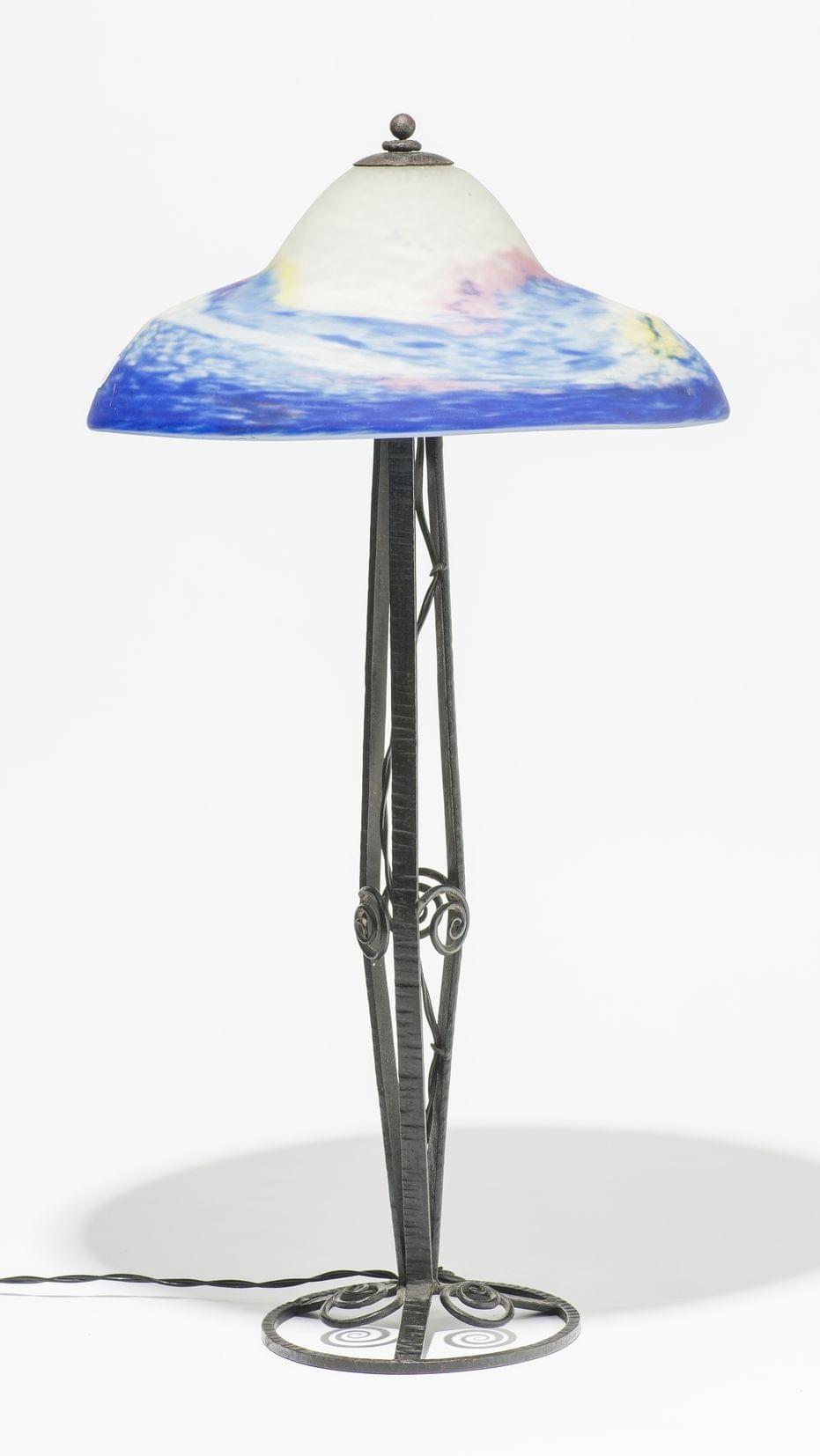 Lampe, abat-jour en verre marbré bleu, jaune et rose piètement en fer forgé à décor de volutes, circa 1920, H 68 cm