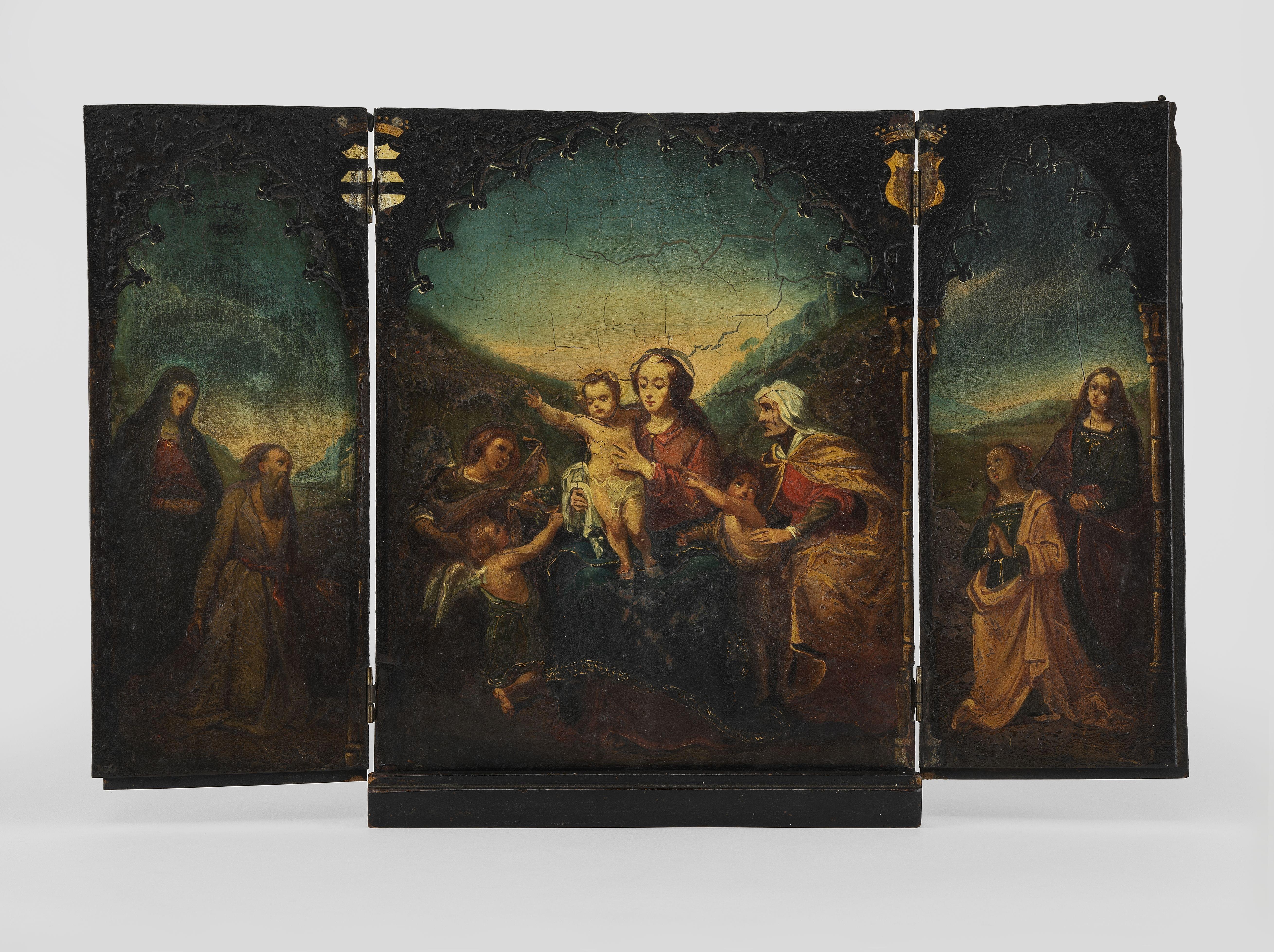 Triptyque de voyage, au centre la Vierge à l'Enfant, Sainte Elisabeth et Saint Jean-Baptiste et deux anges, deux saints accompagnent les donateurs de l'œuvre, huile sur panneau, 28x40 cm