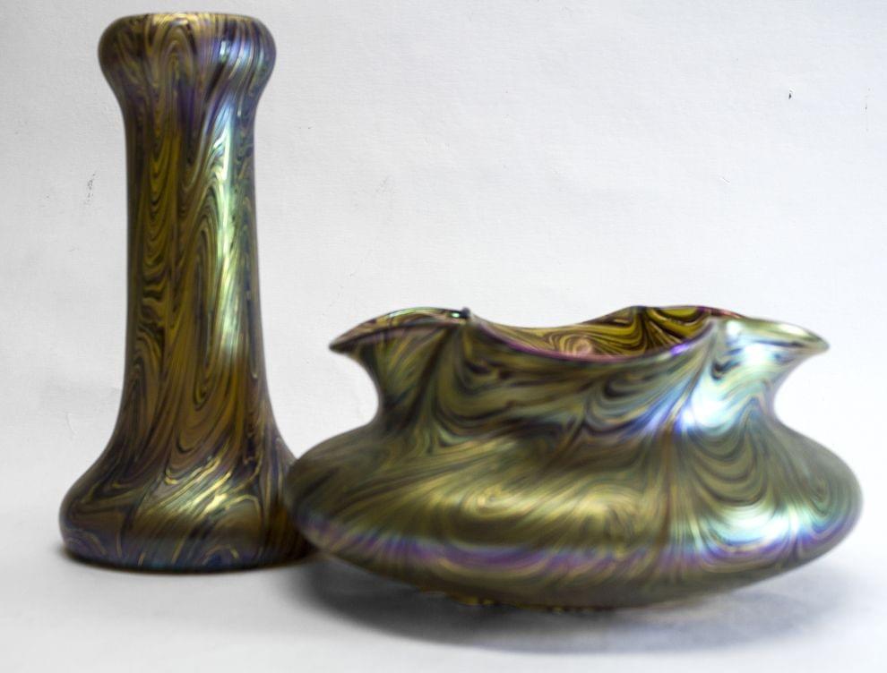 Vase et coupe à bords pincés, verre irisé et doré, H 22, D 24 cm