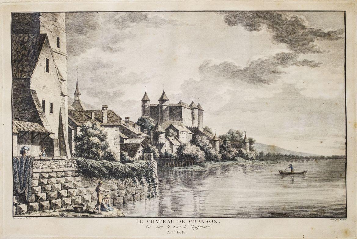 Le château de Granson, gravure aquarellée, 32x49 cm