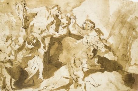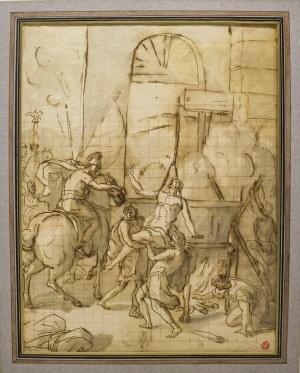 Le Martyre de Saint-Jean l'évangéliste à la porta latina d'après l'oeuvre conservée à l'église Saint-Nicolas du Chardonnet, encre et lavis d'encre, XVIIe/XVIIIe s, 32x22 cm.