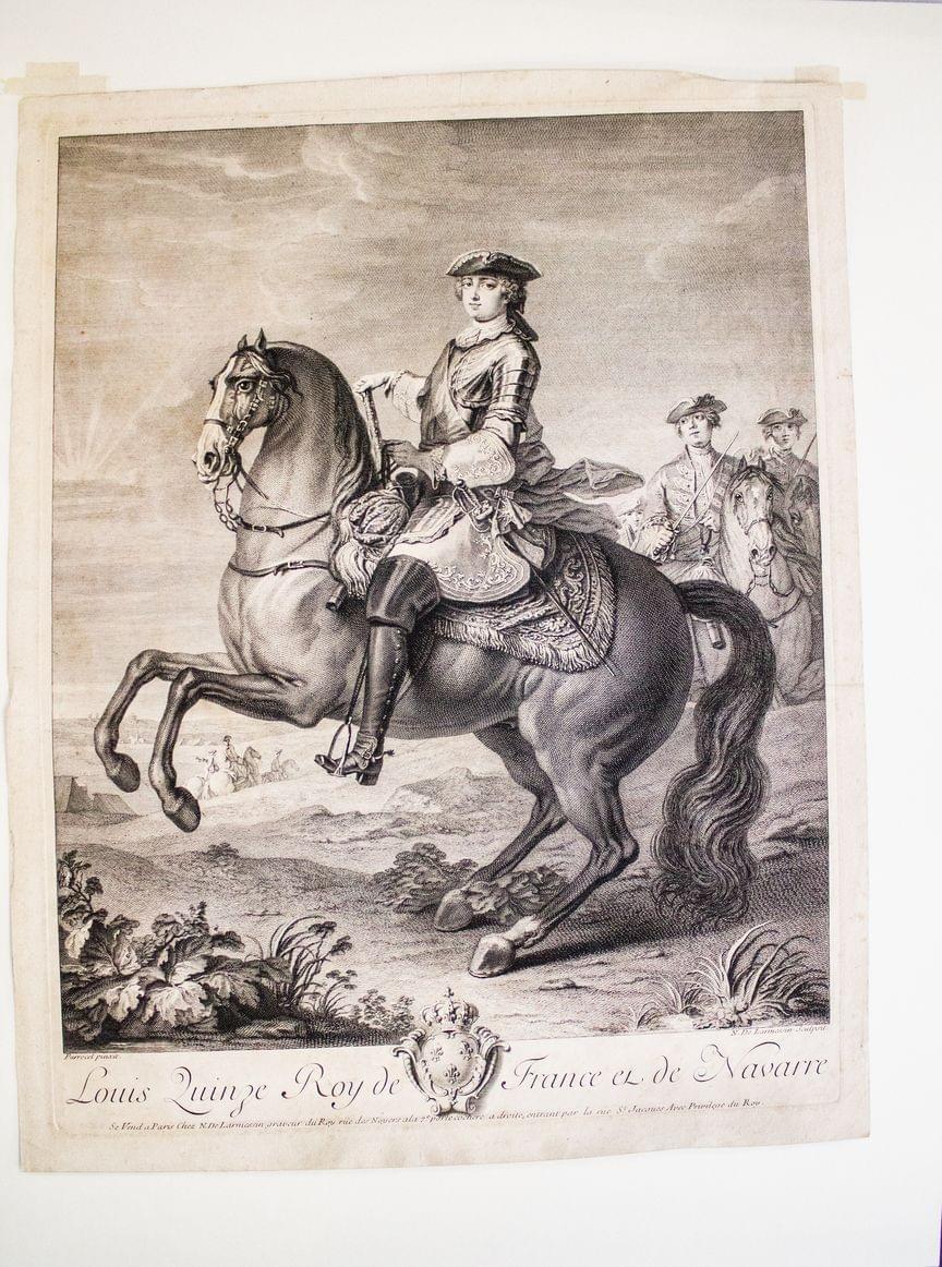 Portrait équestre de Louis XV, gravure sur papier, 43x55 cm