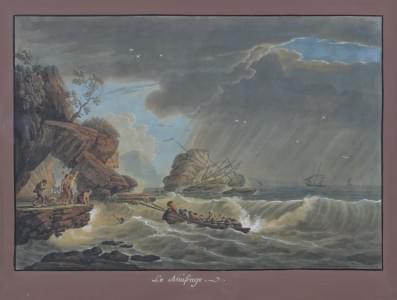 La tempête et Le naufrage, paire de gravures rehaussées, signées...