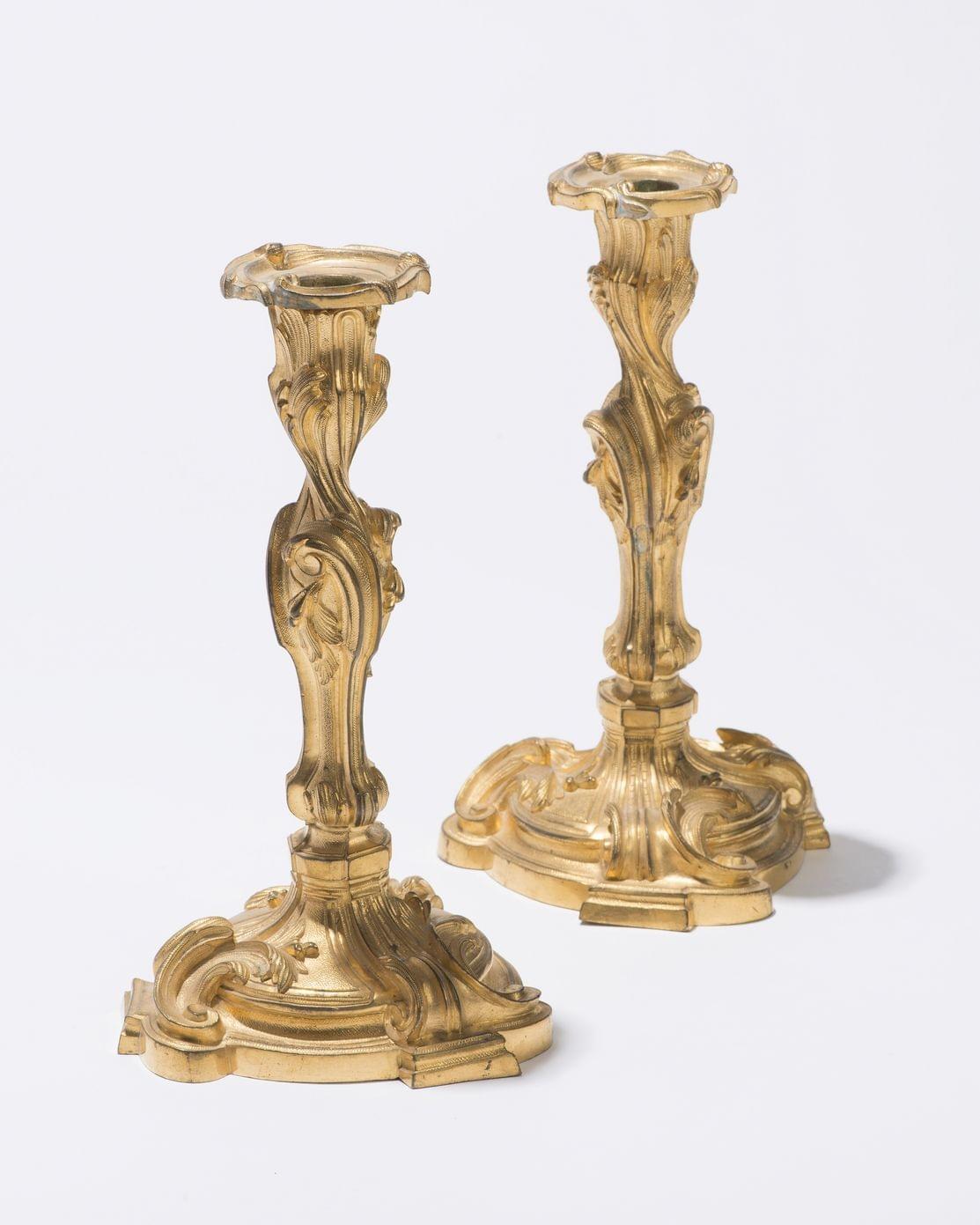 Paire de flambeaux, bronze doré à riche décor rocaille, D 14 cm