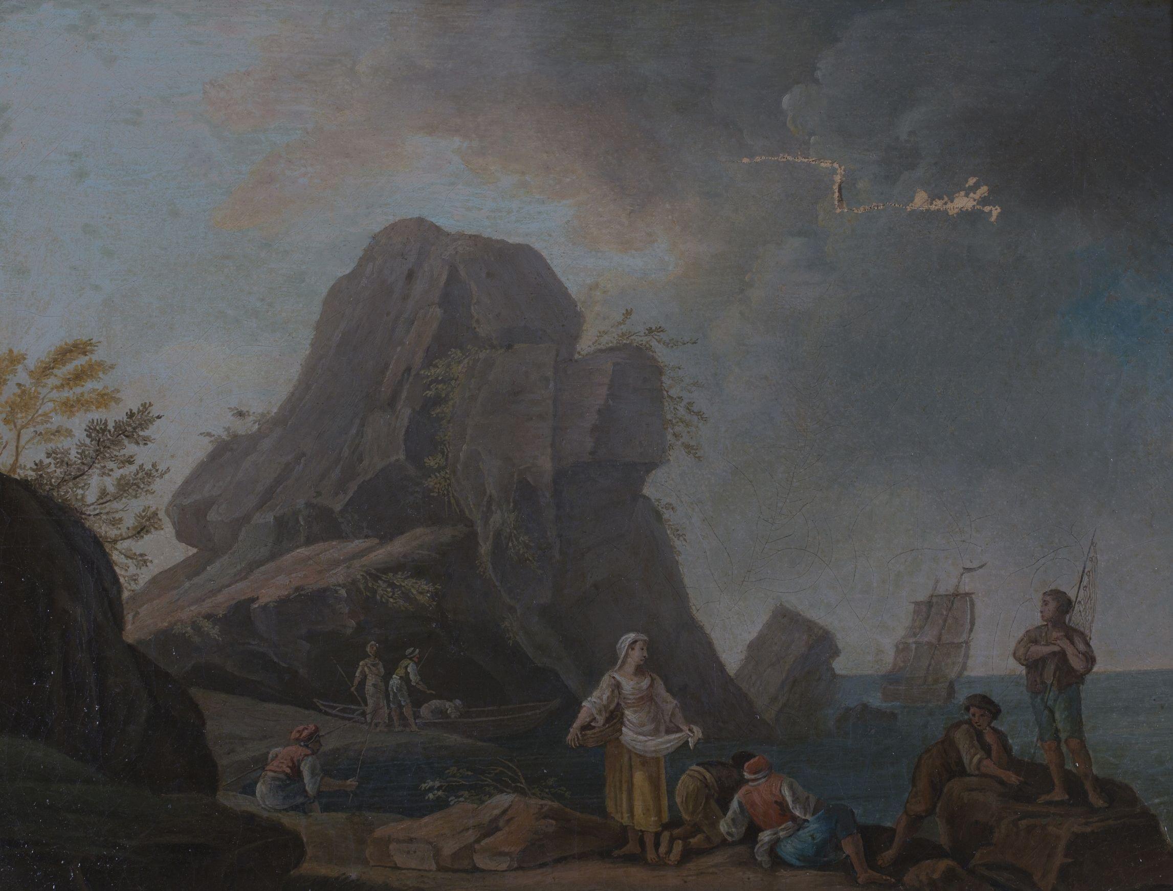 Pêcheurs en bord de mer, huile sur toile, 40x53 cm