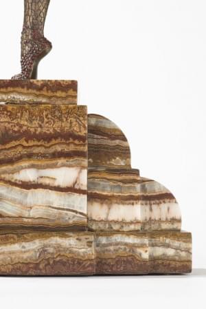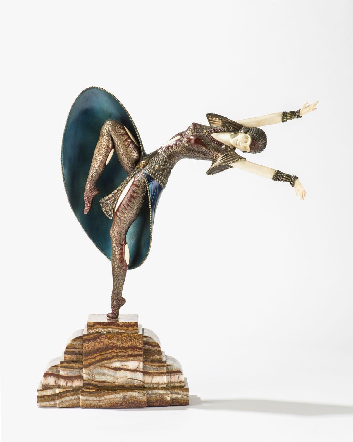 Bronze patiné, peint à froid et argenté, ivoire, base en onyx, porte un cachet Etling Paris au dos, 58x28x12 cm