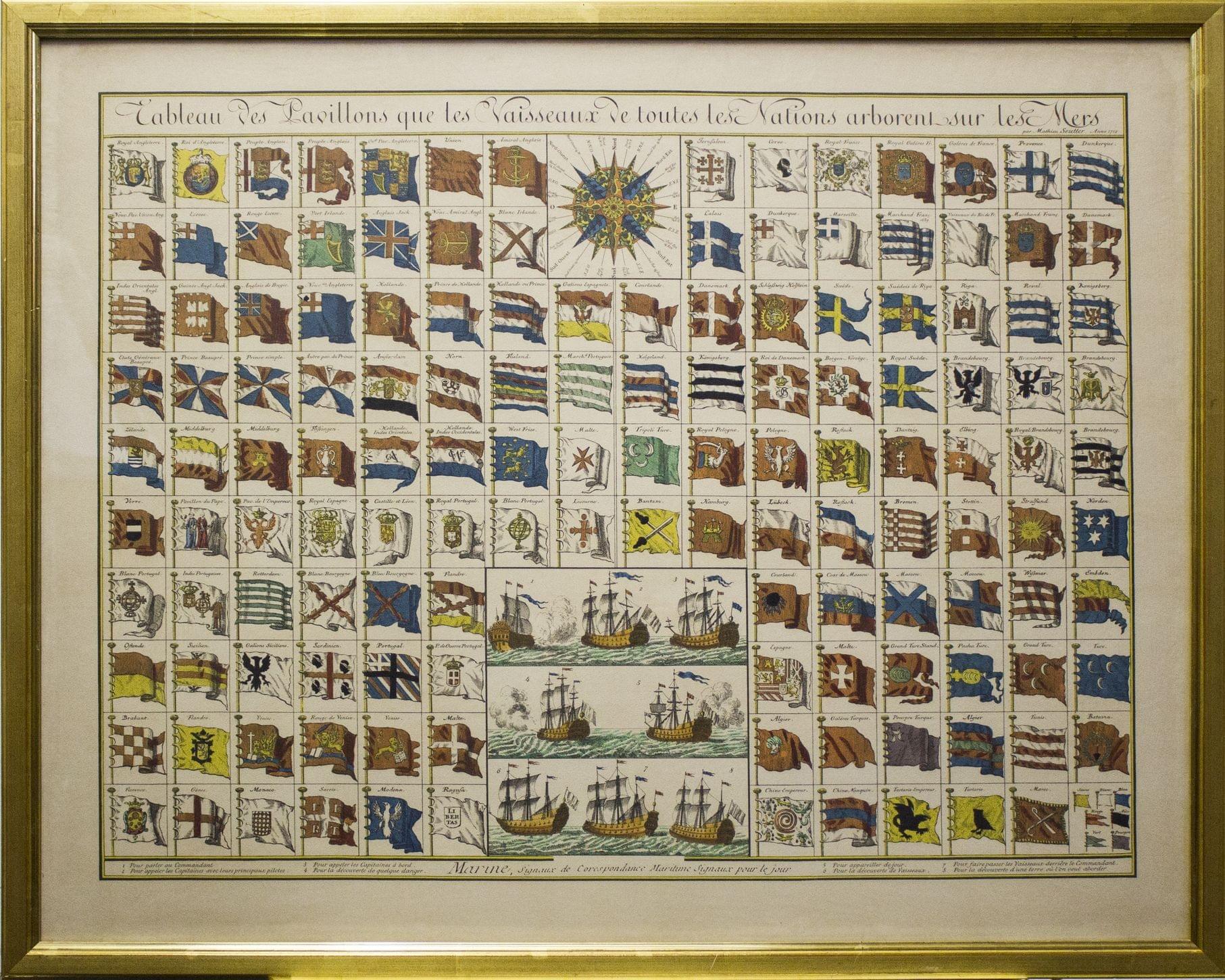 Tableau des pavillons que les vaisseaux de toutes les nations arborent sur les mers, impression en couleurs, 58x73 cm