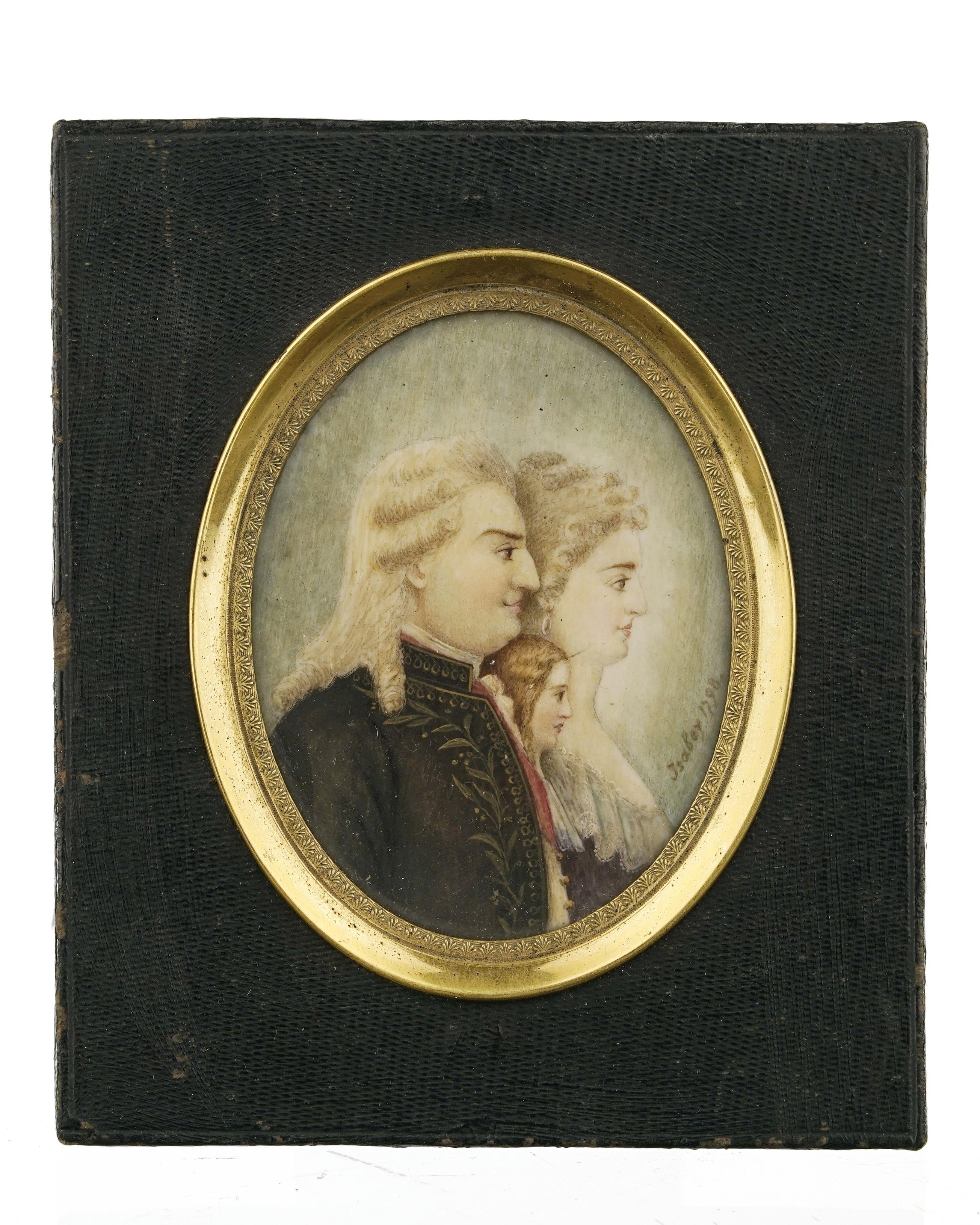 Portrait de Louis XVI, Marie-Antoinette et le Dauphin, miniature sur ivoire portant la signature Isabey et datée 1798, miniature à la gouache, H 9 cm. Collection B. de Saussure