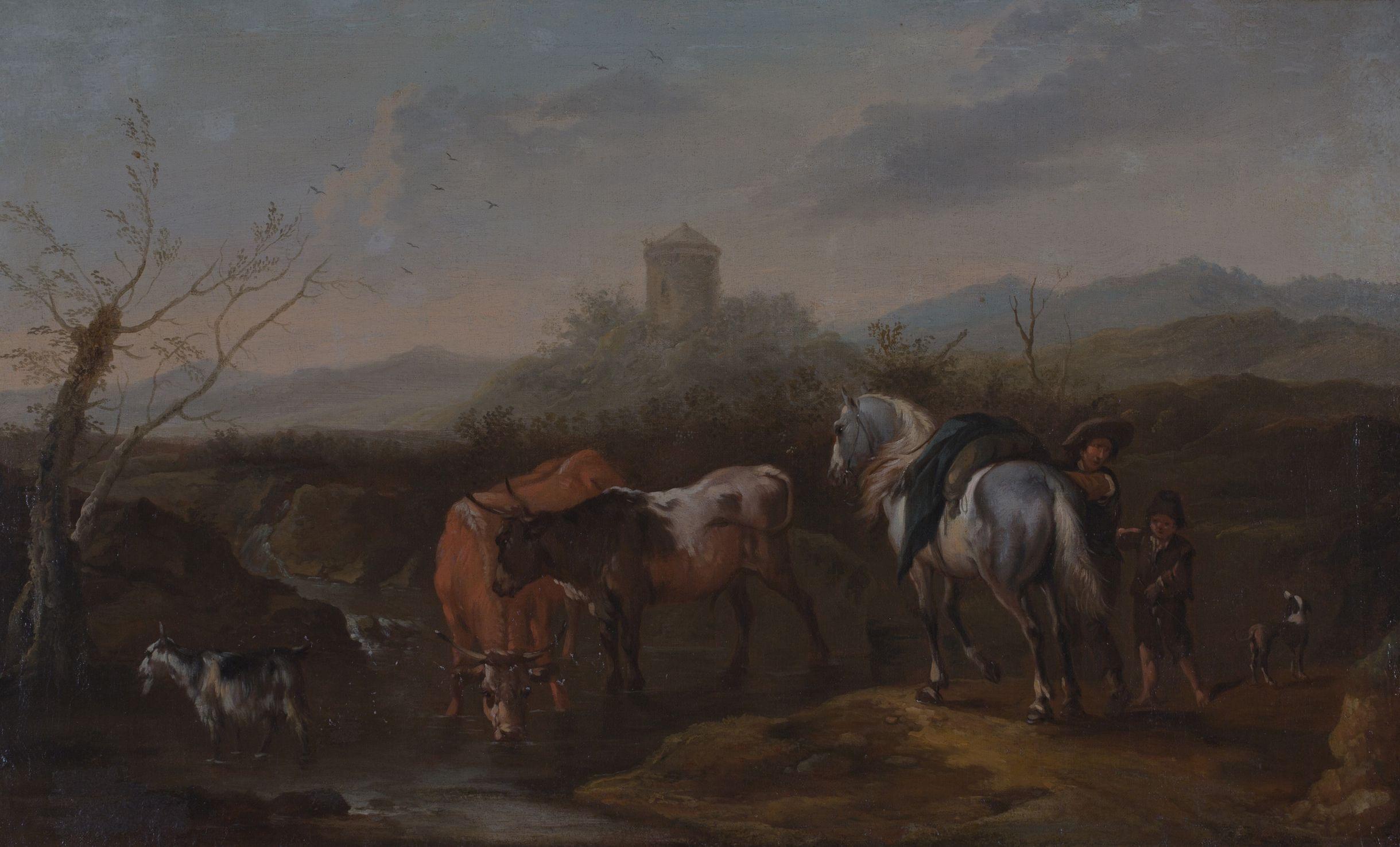 Vaches et chevaux à l'étang, huile sur toile, 41x69 cm