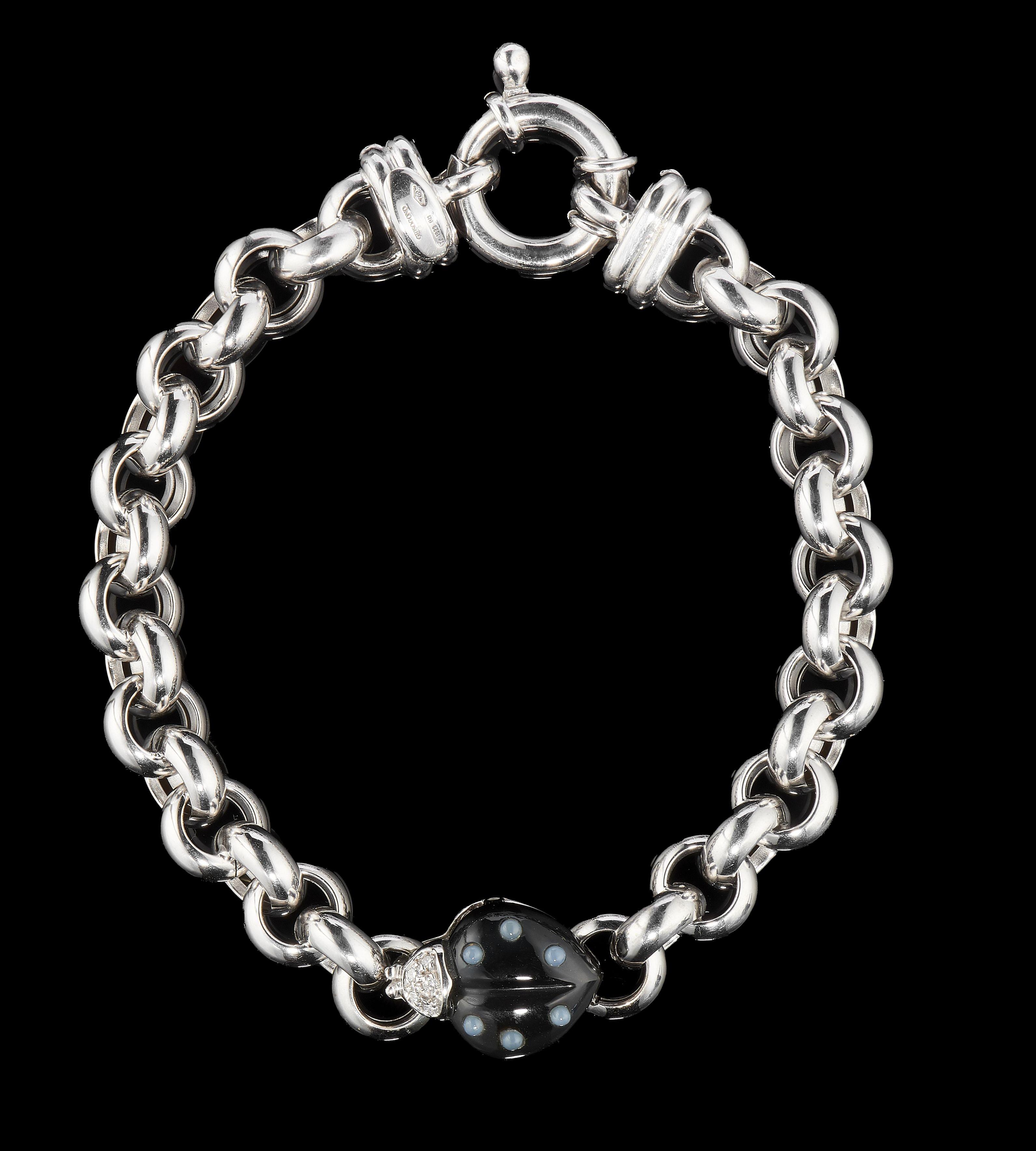 Centré d'un motif de coccinelle en pierre dure et à la tête pavée de diamants, or gris 750, L 18 cm, poids brut 19 g