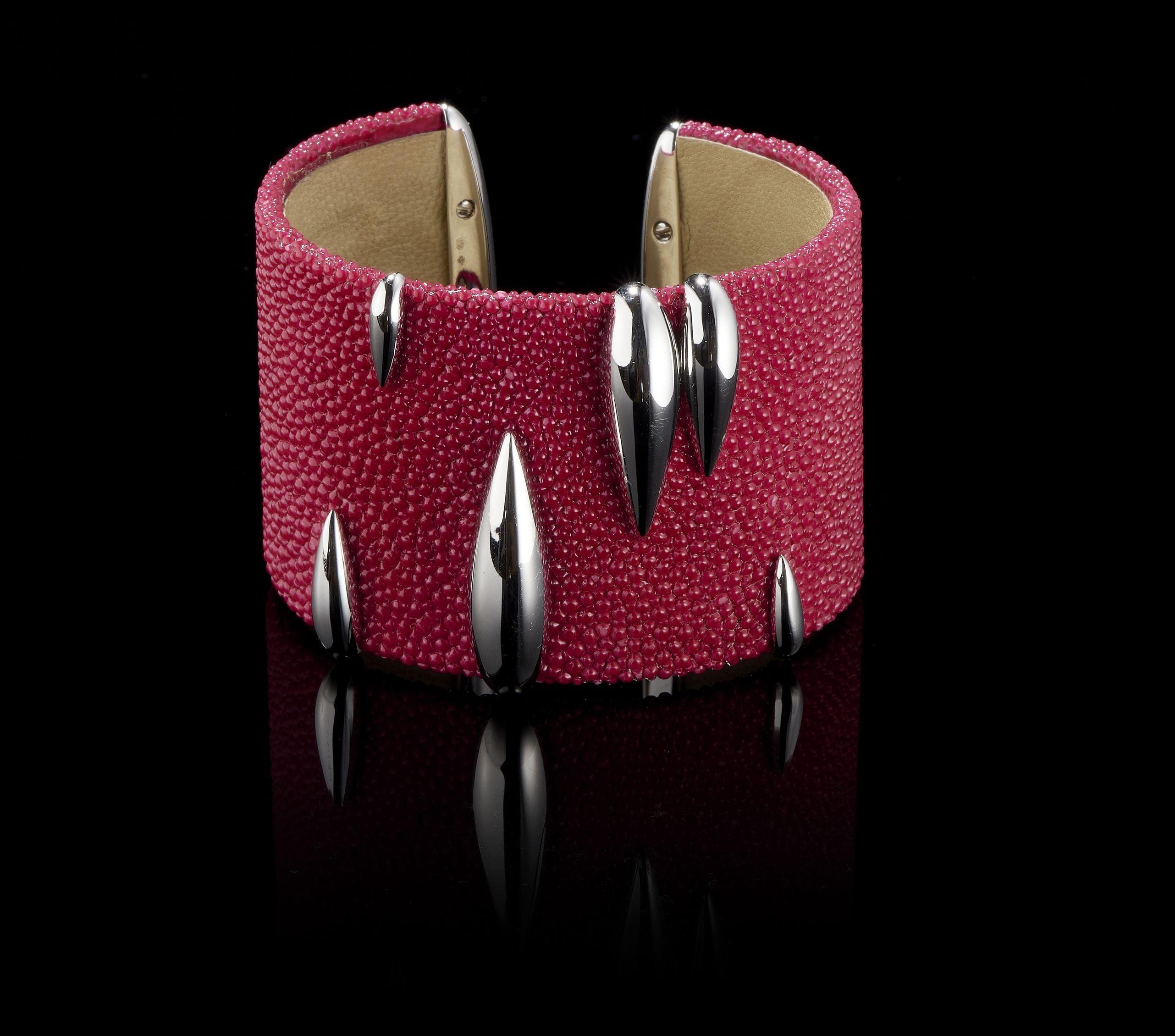 Or gris 750 et galuchat couleur framboise, D 5,5 cm