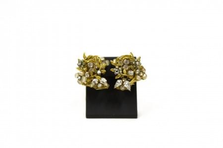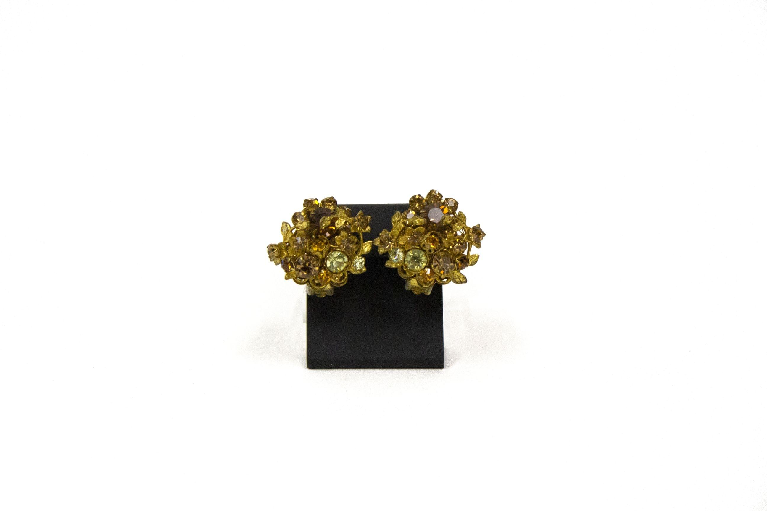 Métal doré, L 19 et 59 cm. On joint deux paires de clips d'oreilles sertis de pierres et perles d'imitation, D env. 2,5 cm.
