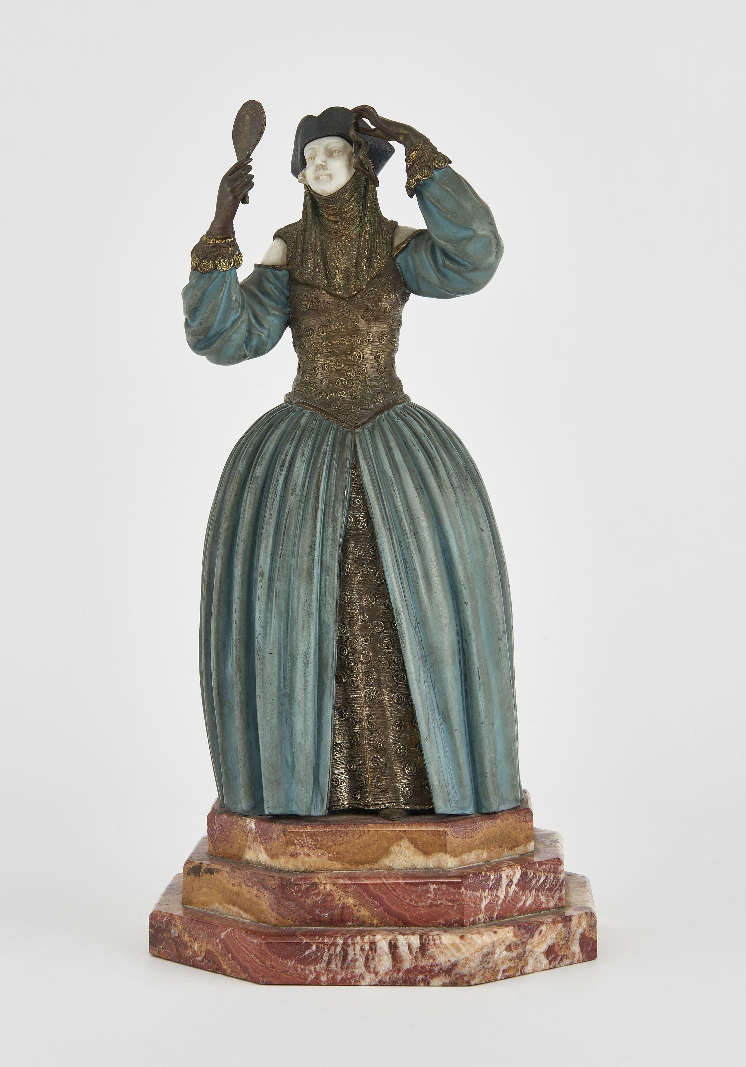 Femme vénitienne, statuette chryséléphantine, bronze à patine verte et ivoire, signée, H totale 37,5 cm