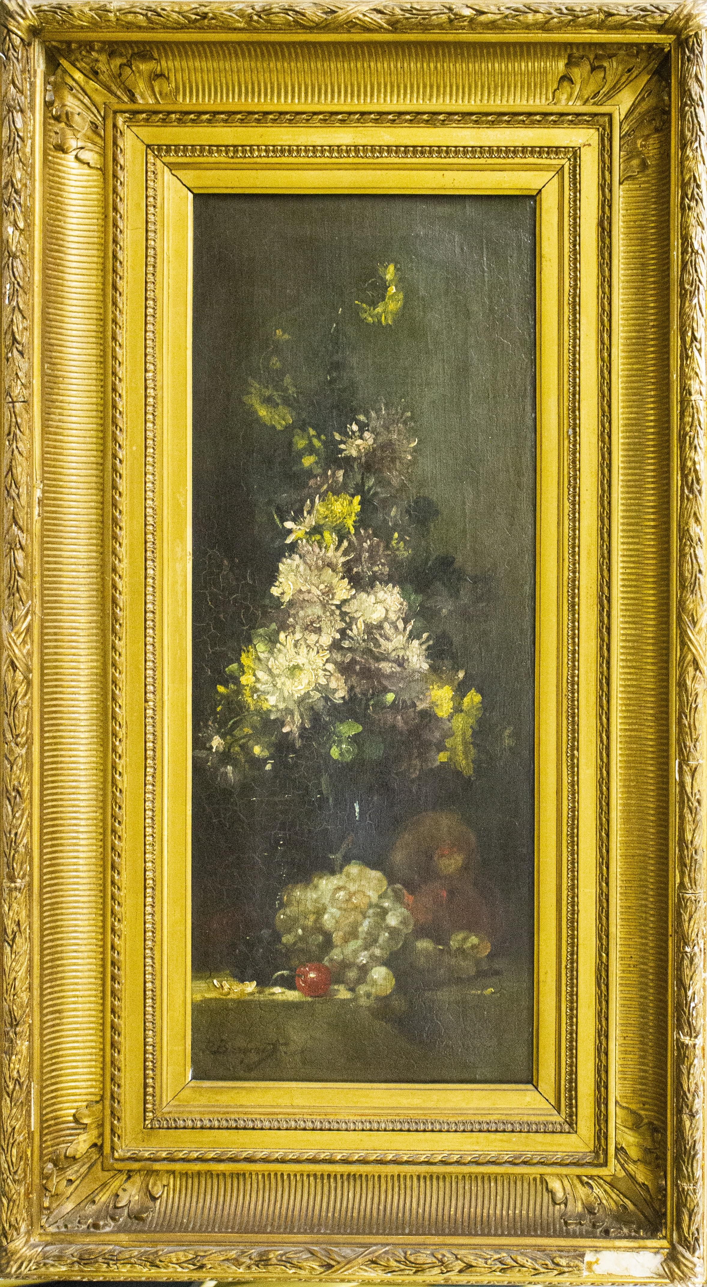Bouquet de fleurs sur un entablement, huile sur toile, signée, 59x23 cm