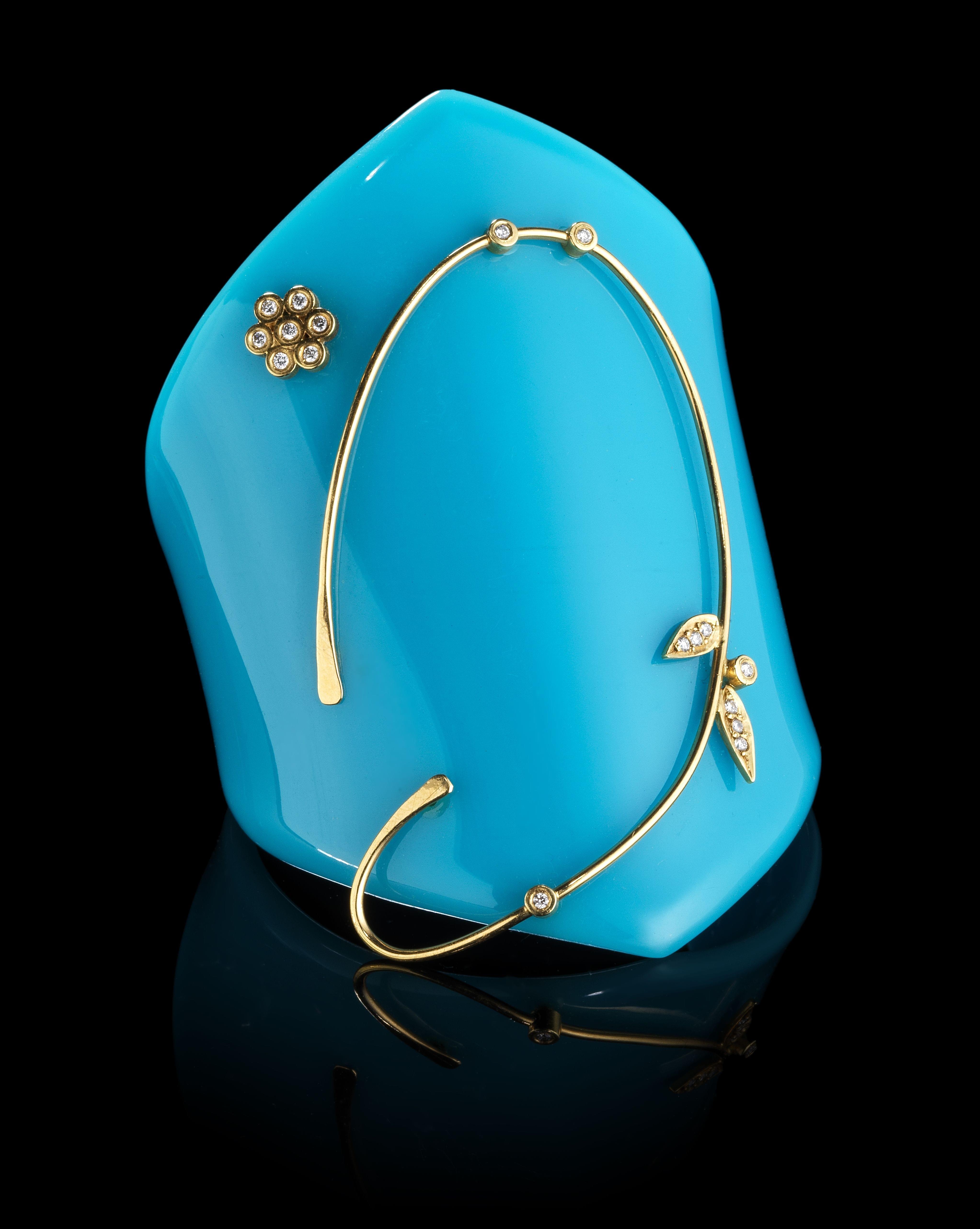 117. Depy Chandris, bracelet manchette en bakélite turquoise ornée d'un motif floral serti de diamants