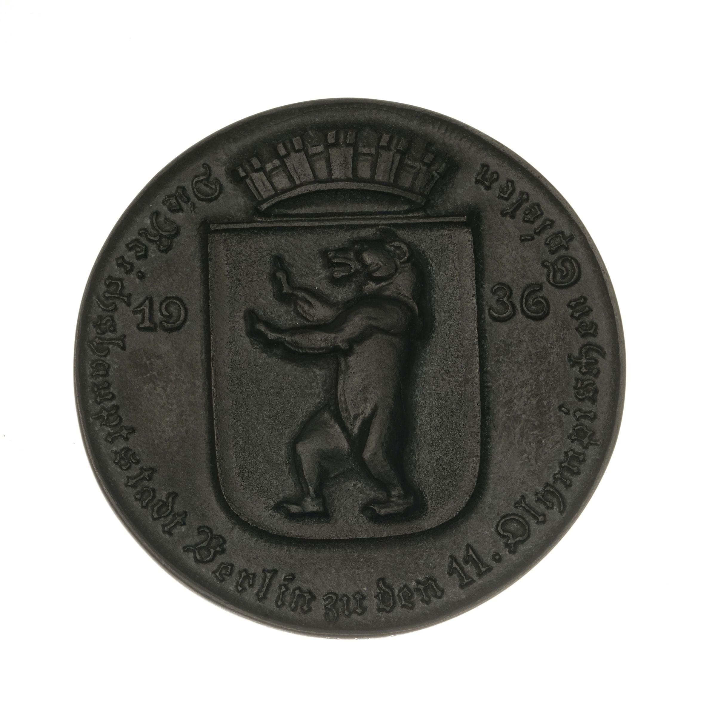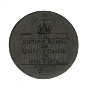 Médaille aux armes de Berlin, dédicacée au verso sur fond de porte de Brandebourg "Nie rastende Arbeit für Volk und Nation ist der Stolz unserer Stadt", fonte, D 9,5 cm, écrin