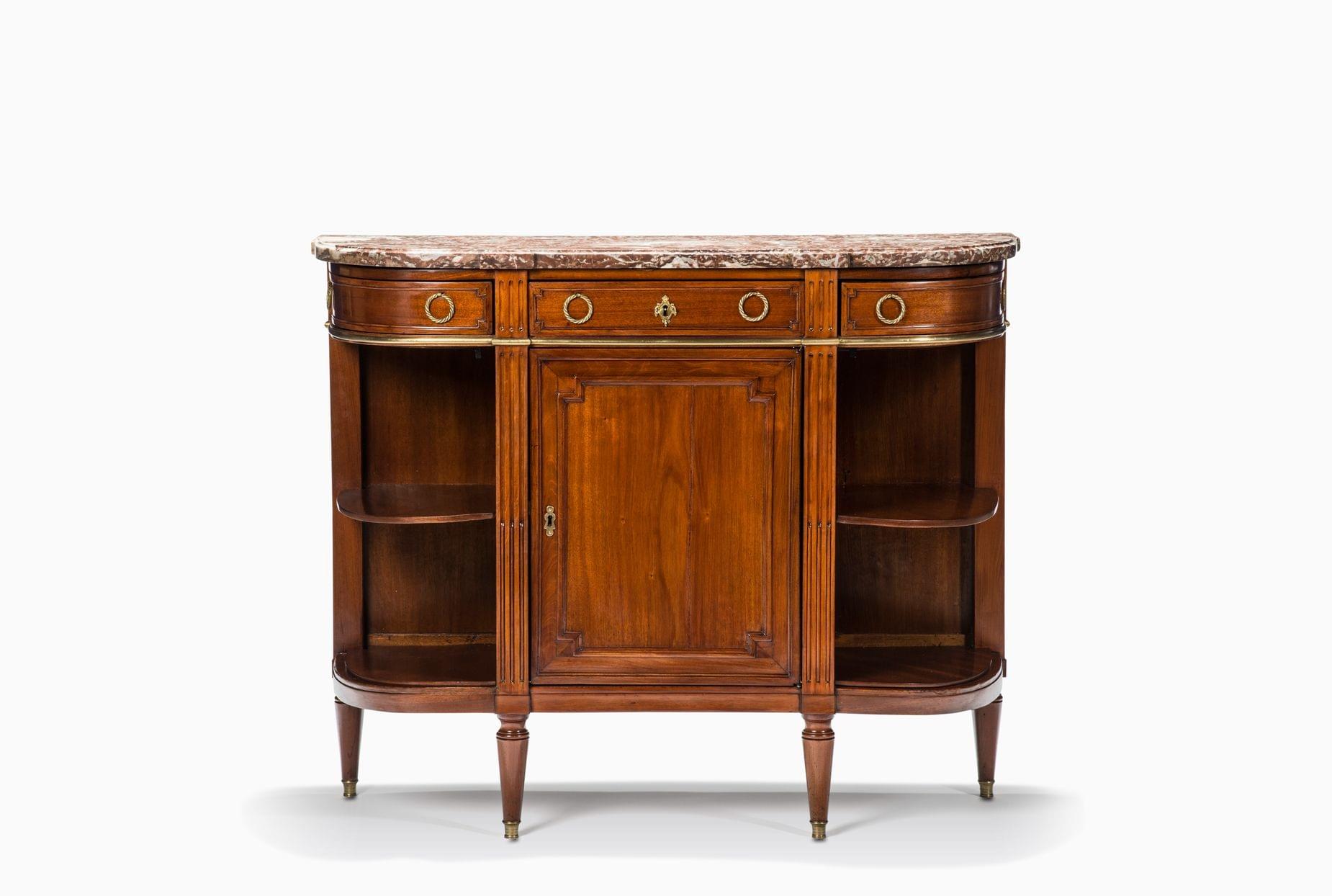Trois tiroirs, un vantail et deux étagères, acajou, laiton et marbre brèche rouge, 103x126x42 cm