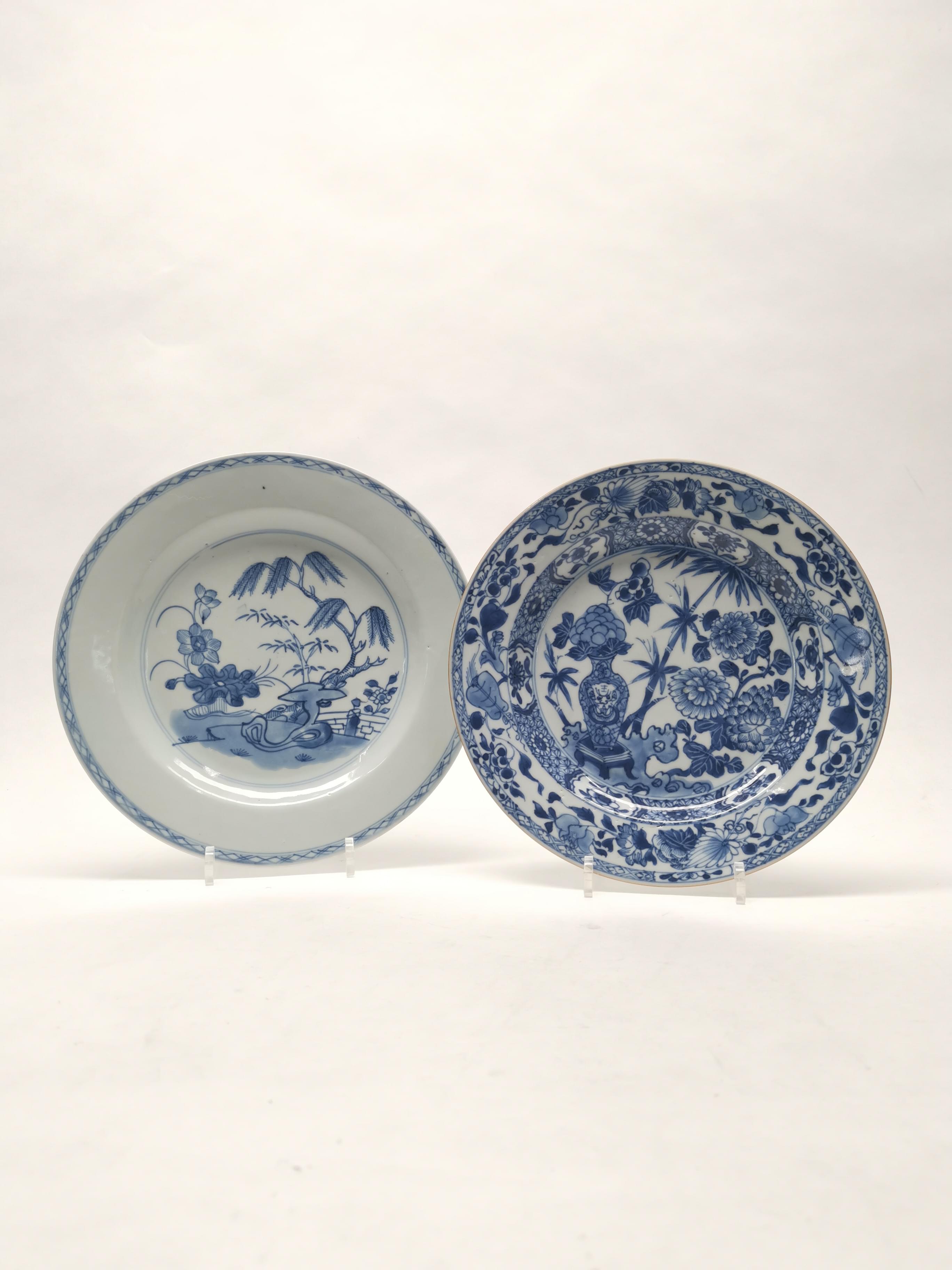 Porcelaine émaillée bleu blanc à décor de jardin, motifs floraux et saule, D 23 et 32 cm