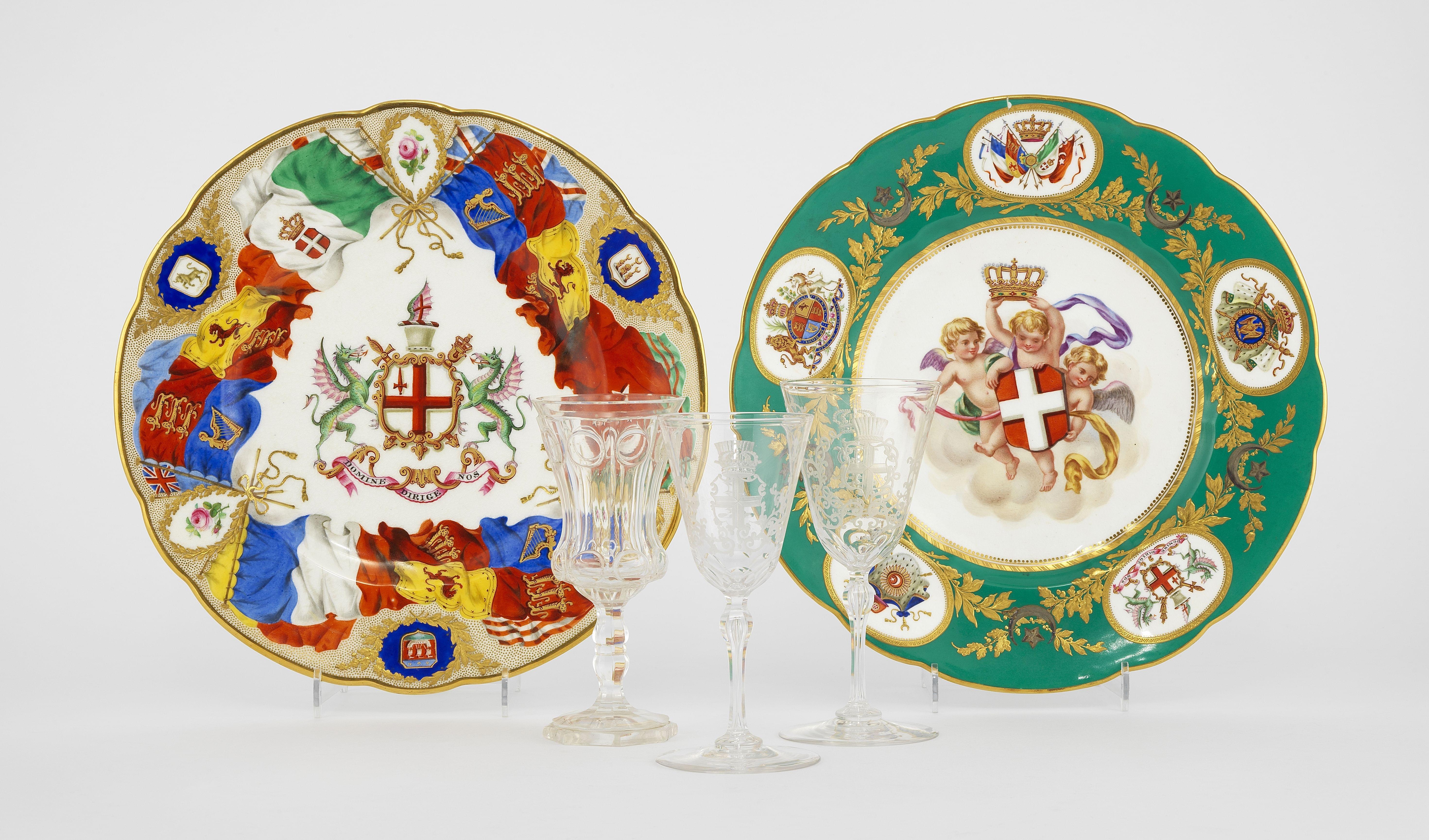 7. Deux assiettes et 3 verres aux armes de la famille royale de Savoie et de la ville de Londres