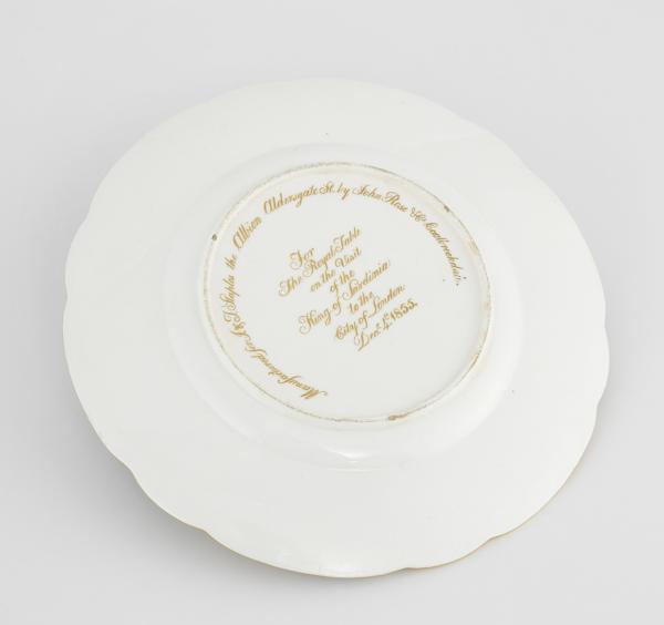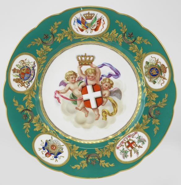 Porcelaine peinte et verre gravé, dédicace et signature au verso, "For the Royal Table", John Rose & Co, Coalbrookdale. Ensemble offert par la Reine Victoria d'Angleterre au roi Victor Emmanuel II de Sardaigne à l'occasion de sa visite à Londres le 4 décembre 1855, D 25 cm. Illustré dans: Casa Savoia, The Royal House of Savoy, Story of an Italian Family, Electra, 2009, pp 192-193. Provenance: Collection Prince et Princesse de Savoie. Provenienza: Collezione Principe e Principessa di Savoia
