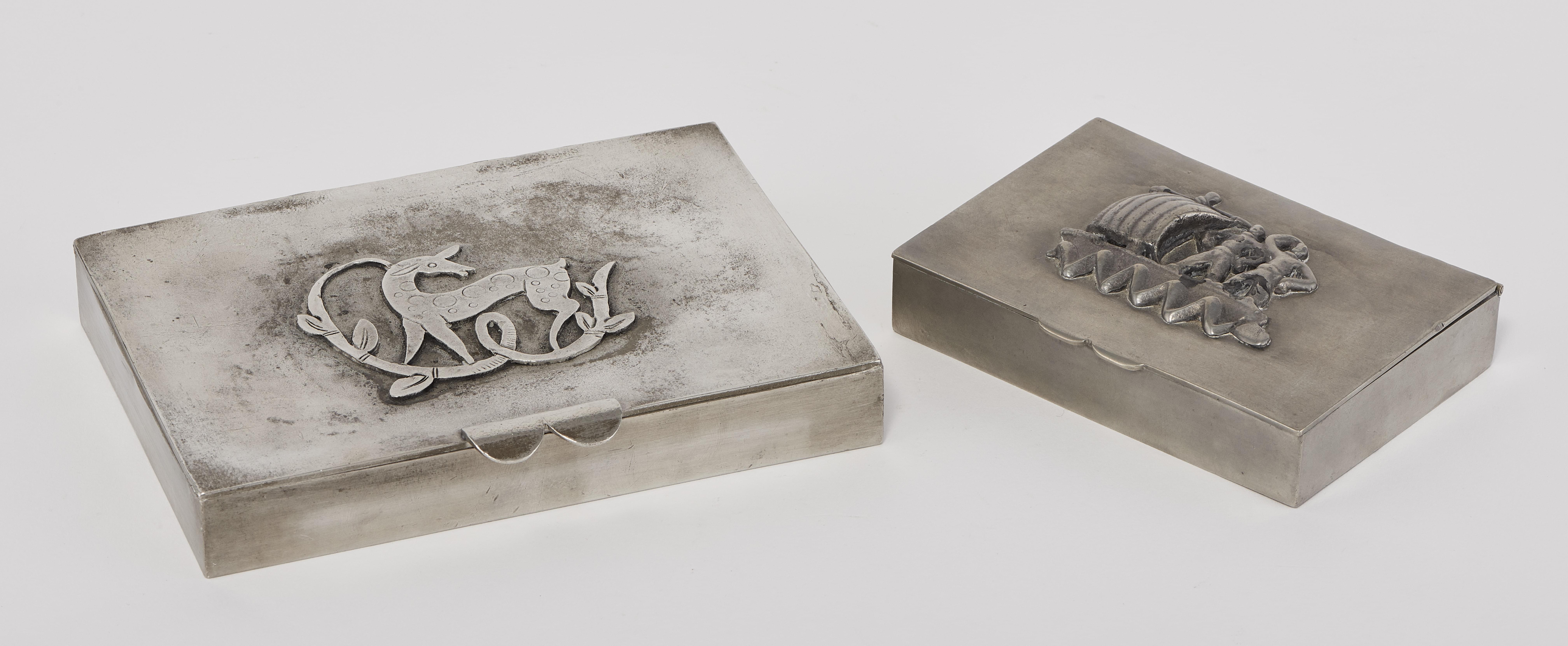 1061. Deux boîtes à cigarettes rectangulaires à motifs appliqués de deux naufragés et d'une biche,