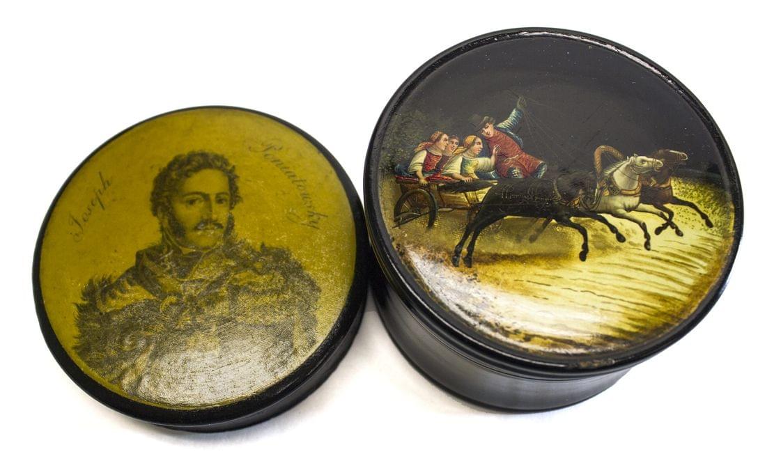 Carton bouilli l'une figurant Jospeh Poniatowski et l'autre à décor de troïka, signé Vichniakow, D 9 cm
