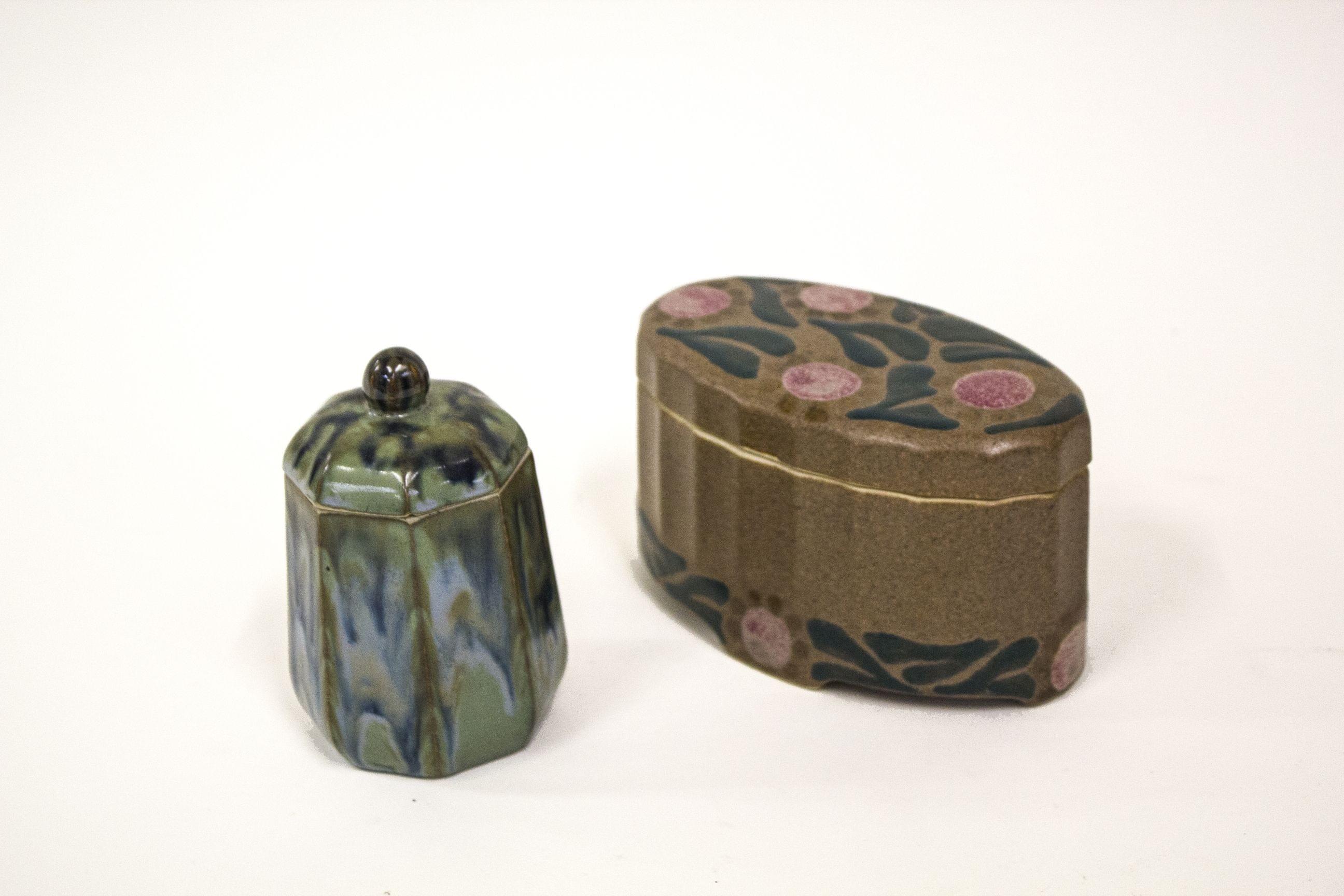 Grès émaillé à décor de fleurs et marbré vert, H 9 et 10 cm