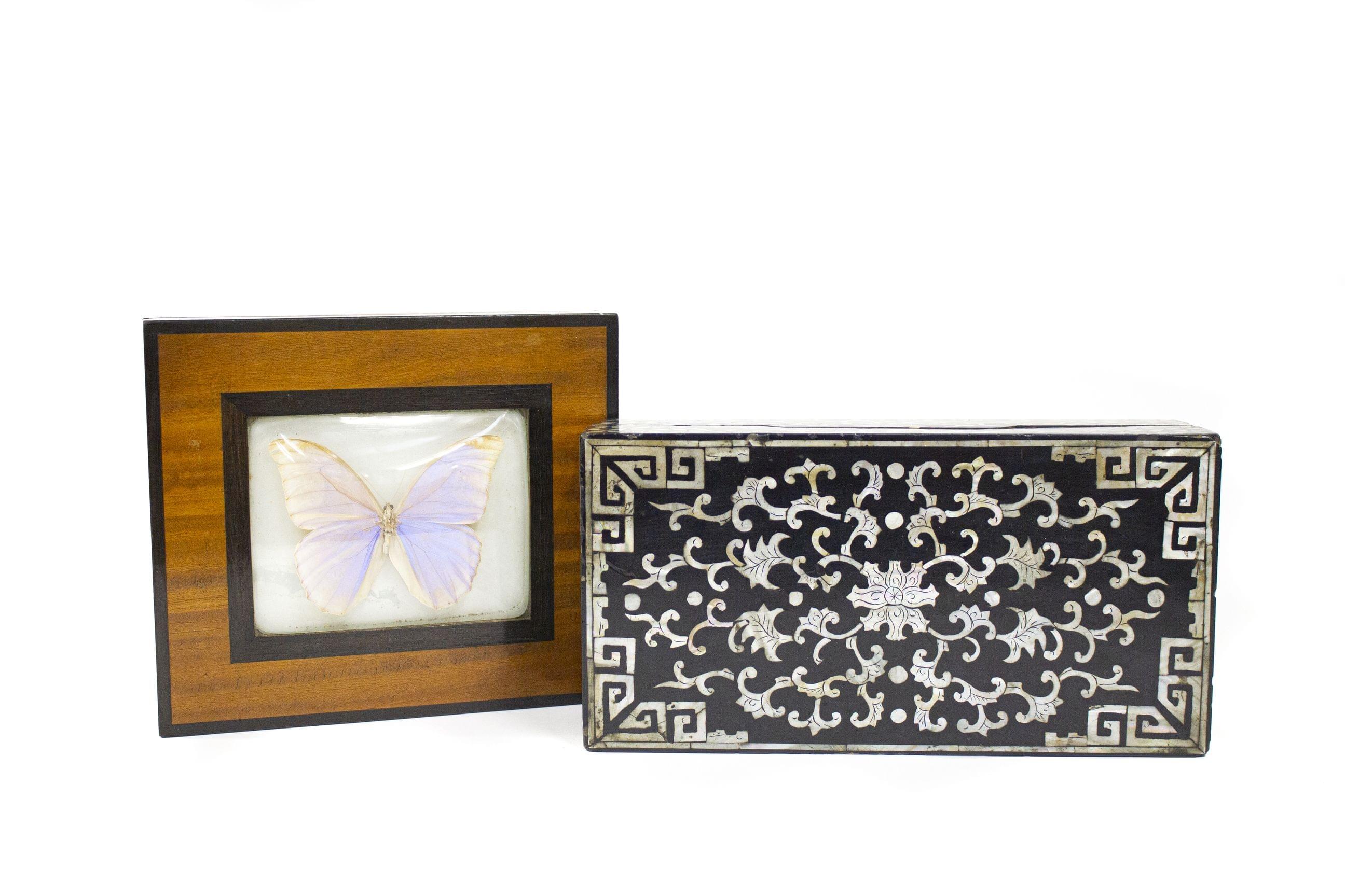 4105. Deux boîtes, l'une ornée d'un papillon, l'autre en nacre et bois noirci