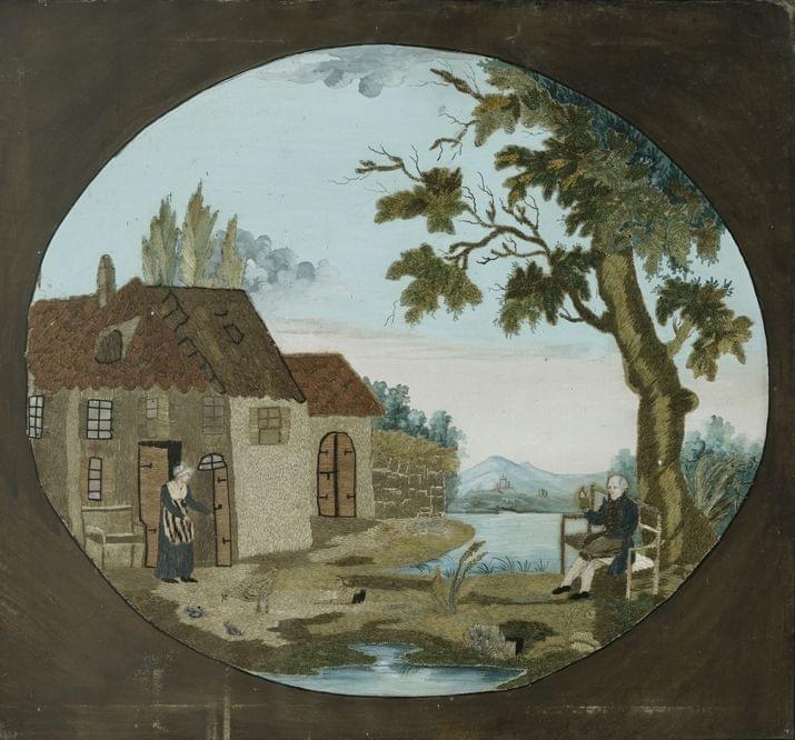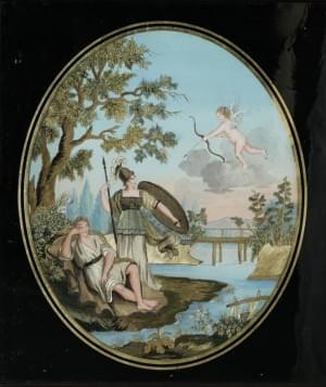 Verre à décor de paysage lacustre et élégantes, H 8 cm