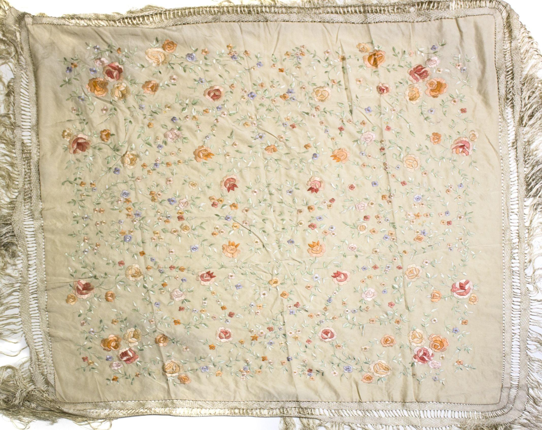 L'un à décor d'oiseaux et fleurs sur fond noir, env. 145x145 cm, et l'autre à décor de fleurs sur fond crème, env. 130x115 cm