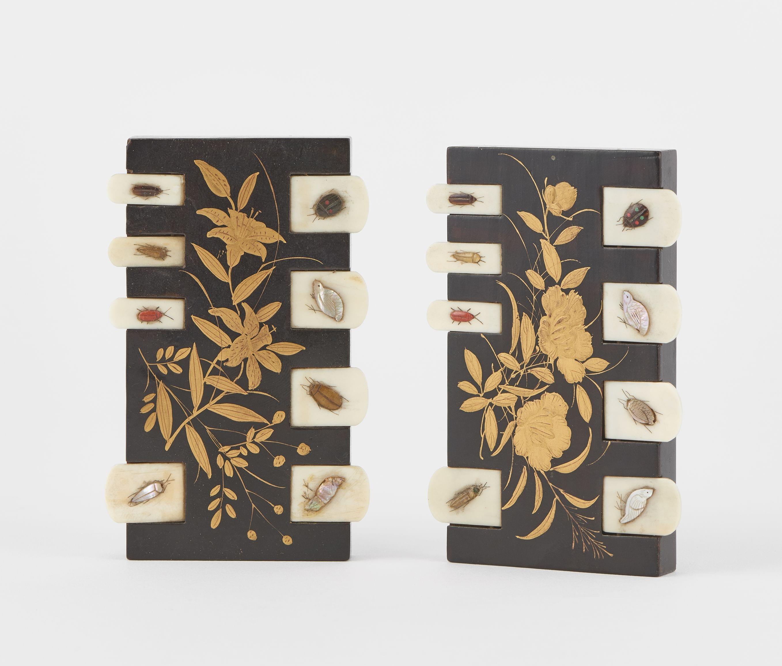 Bois laqué noir et or à motif floral, ivoire et incrustation de nacre à motifs d'insectes, 9x5 cm.