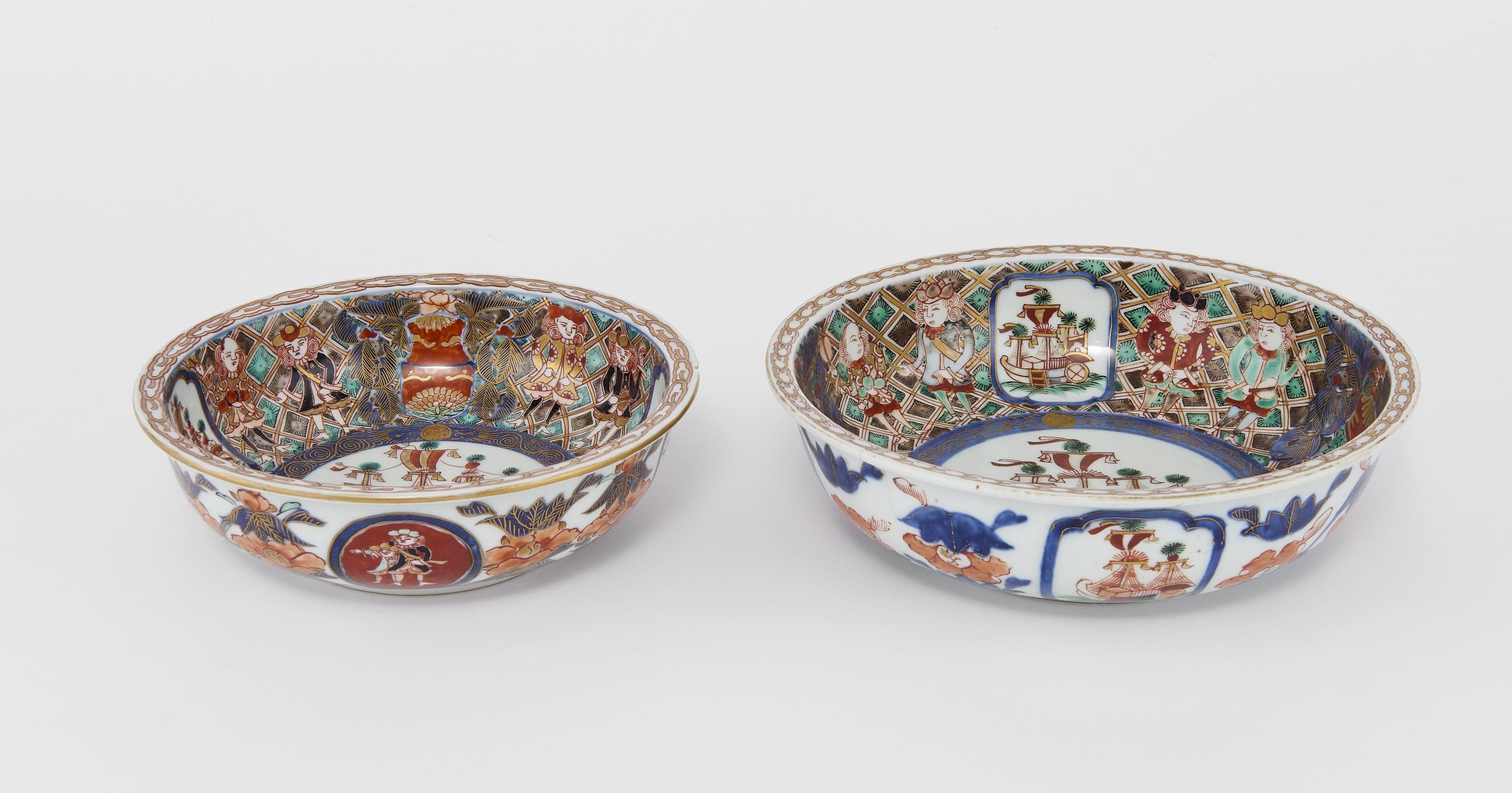 Porcelaine émaillée polychrome à décor de personnages et navires néerlandais, D 18 et 21 cm