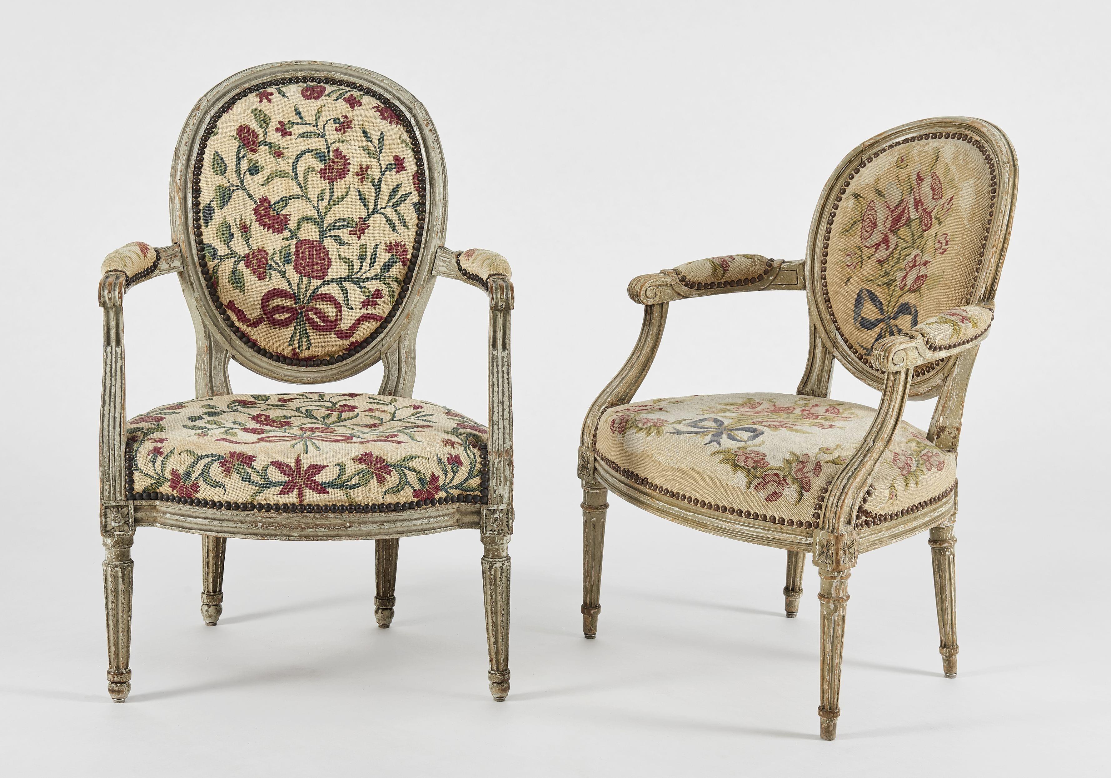 Dossier médaillon, bois laqué gris et garniture aux petits points. Provenance: collection Pernet-Villaverde