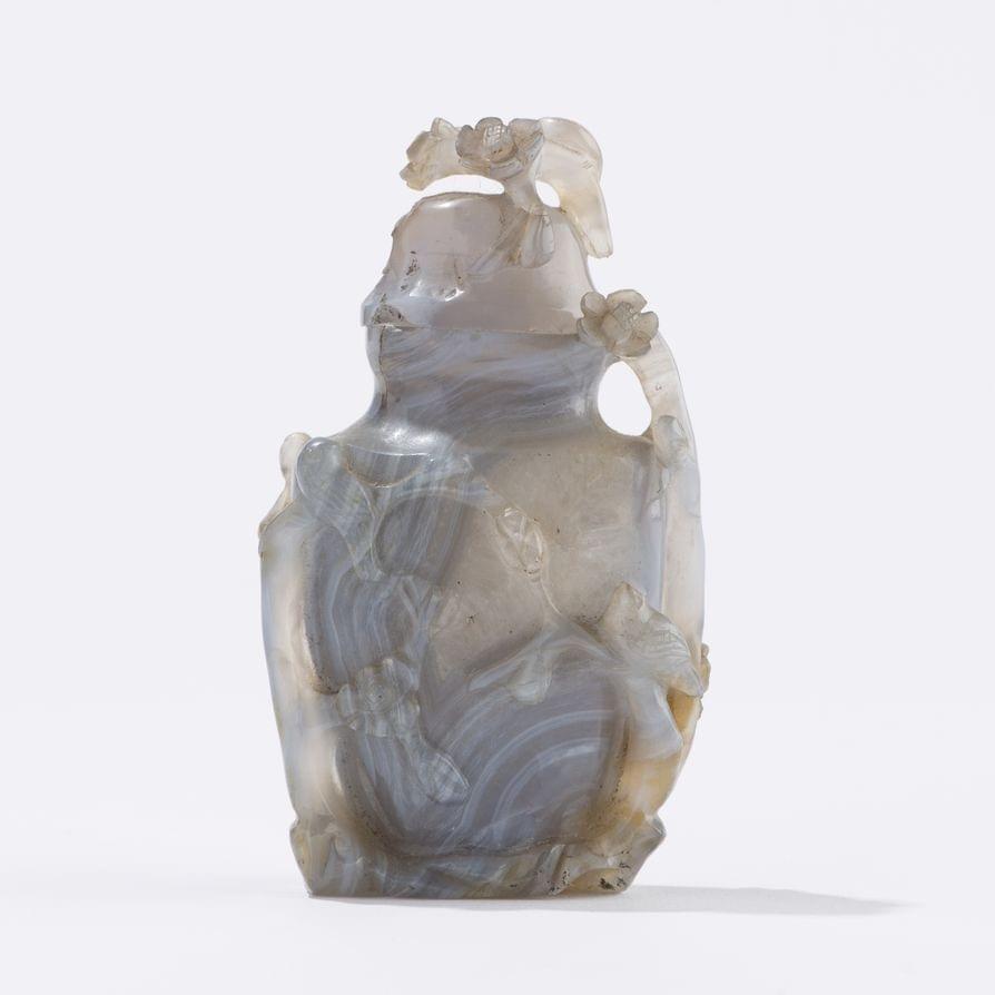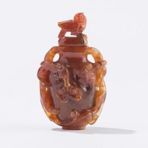 L'un en cornaline à décor de félins stylisés et d'un faucon, et l'autre en agate à décor de fleurs et d'oiseaux, Chine, H 11 et 10,5 cm